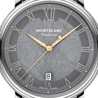 The Montblanc Tradition Automatic Date comes in a 40 mm stainless steel case with straight horns and a double-shaped bezel. The timepiece features a grey dial depicting the topography of the Mont Blanc with rose gold-colored Roman numerals and a prominent Roman “XII”. The sword-shaped hour and minute hands, the seconds hand and crown with Montblanc emblem and the interchangeable stainless steel bracelet complete its contemporary elegant appearance. Ident No. MB132433 Movement MOVEMENT TYPE Automatic movementHours - Minutes - Seconds - Date POWER RESERVE 38,0 h FREQUENCY (VPH) 4 /h FREQUENCE (HZ) 28800,0 Hz NUMBER OF JEWELS 26 Jewels Case CASE DIAMETER 1.57 inches CASE HEIGHT 0.34 inches WATER RESISTANT 3 bar (30 m) bar SAPPHIRE CRYSTAL Sapphire crystal case back