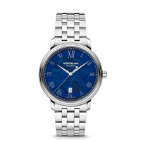 The Montblanc Tradition Automatic Date comes in a 40 mm stainless steel case with straight horns and a double-shaped bezel. The timepiece features a blue dial depicting the topography of the Mont Blanc with silver-colored Roman numerals and a prominent Roman “XII”. The sword-shaped hour and minute hands, the seconds hand and crown with Montblanc emblem and the interchangeable stainless steel bracelet complete its contemporary elegant appearance. Ident No. MB131275