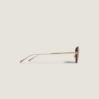 These sunglasses in a round style have a gold-coloured metal frame and brown lenses. Inspired by the nib design of the writing instruments, a decorative nib detail is featured on the metal temple design. The Montblanc one line logo is engraved on the right side of the temple, additionally the logo is lasered on the left lens and a decorative detail is engraved on the end tips of the temple. Ident No. MB135570