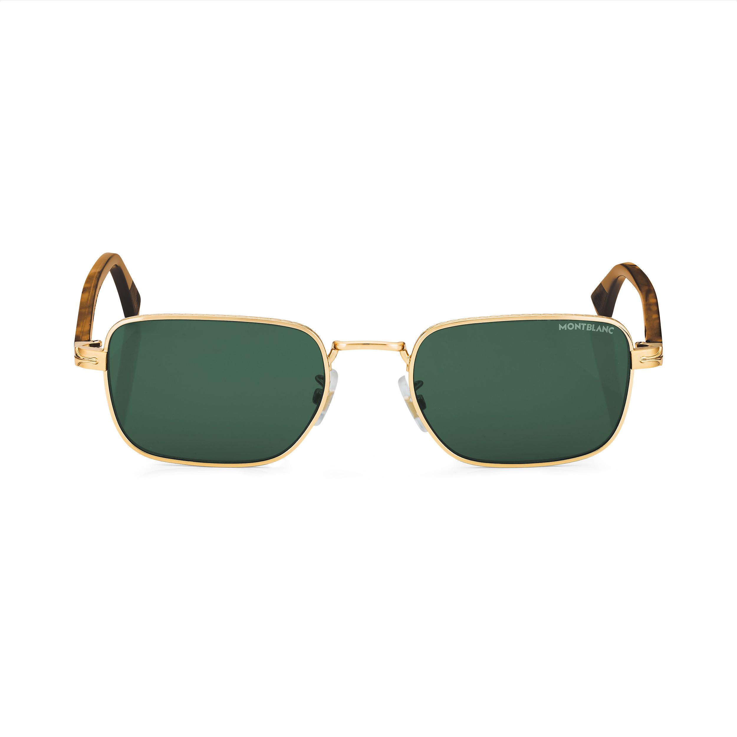 These rectangular sunglasses feature a gold-colored metal frame and gray lenses. Inspired by the nib design of the writing instruments, a decorative nib detail is featured on the acetate temple design. The Montblanc logo is lasered onto the left lens and the anti-slip pattern is lasered onto the internal side of the temple tips to increase comfort. Ident No. MB133462