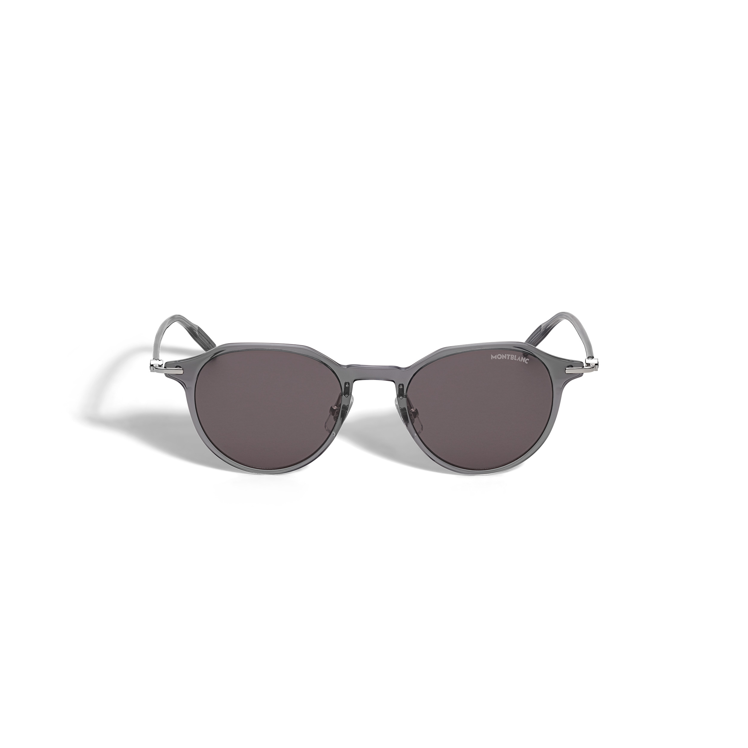 These sunglasses in a round style have a grey-coloured injected frame and grey lenses. The snowcap Montblanc Emblem is encapsulated in the metal temple design. The Montblanc logo is lasered on the left lens and the anti-slip pattern is lasered onto the internal side of the transparent temple tips to increase the comfort. Ident No. MB134458