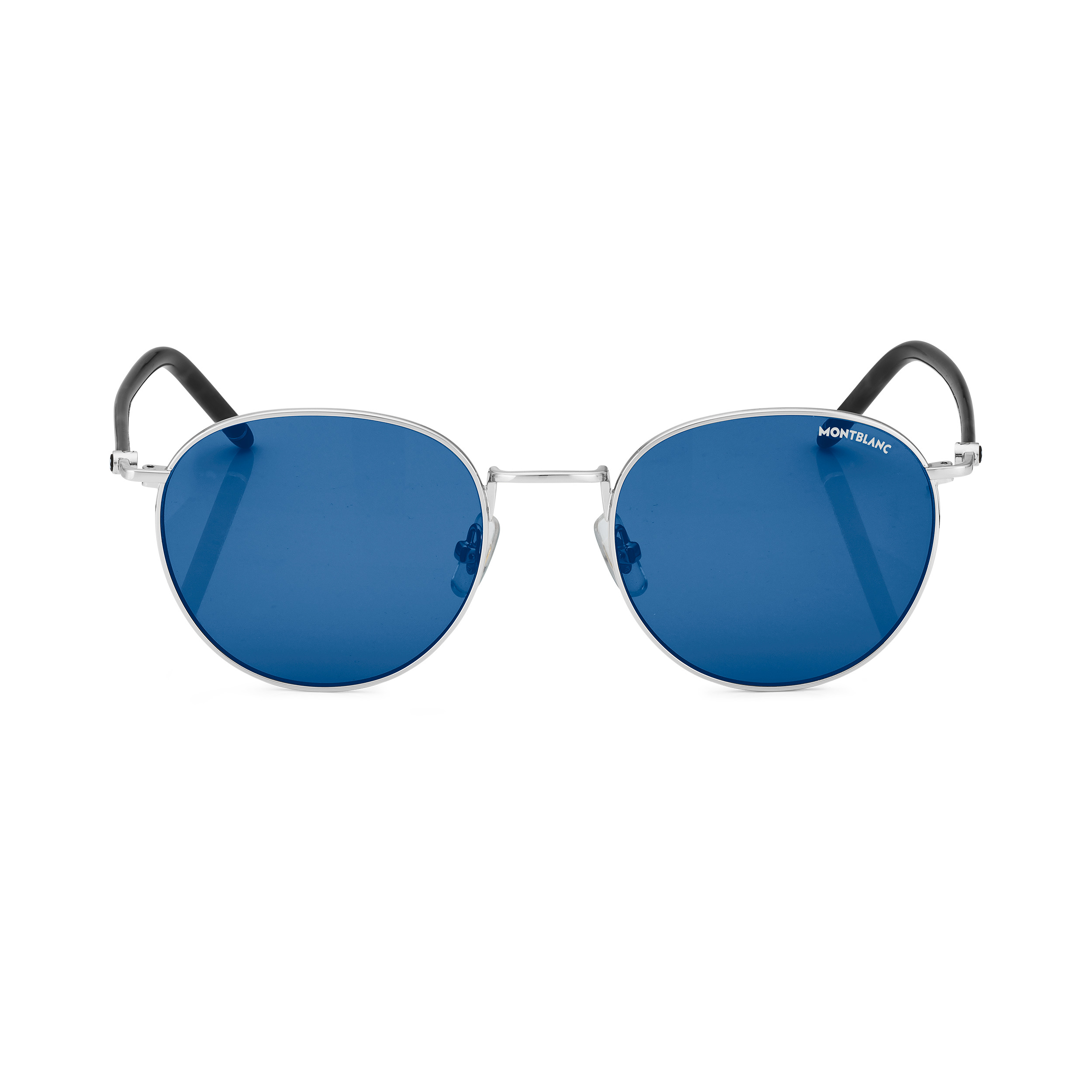 These round sunglasses feature a ruthenium-colored metal frame and blue lenses. The tubular temple is inspired by the Meisterstuck writing instruments and enriched with a black enamel detail on the temple tips. The Montblanc logo is lasered on the left lens and the snowcap logo is encapsulated on the temple. Ident No. MB133464