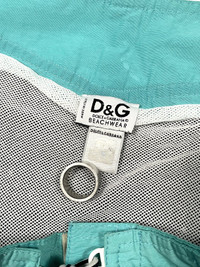 D&G swimwear trunks in teal/blue/white color block. Pocket on thigh with logo patch. Netting inside with drawstring closure. Made in Italy. Would fit a 32” waist best but could be adjusted up or down a size. Vintage, with a few markings throughout. 16” waist 9.5” front rise 9.5” inseam 10.5” leg opening