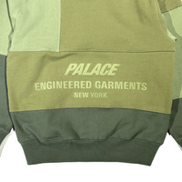 Palace x Engineered Garments zip up hoodie from FW22. Patchwork construction. Heavyweight cotton/polyester blend. Front zip closure with snap buttons at collar. 2 front pockets with logo print above left one. Puff print logos on rear panel. Ribbed cuffs and hem. 83% cotton, 17% polyester. Made in China. Worn sparingly, in excellent condition. No flaws to note. Tagged a size S, fits TTS 18” shoulder 21” chest 18” hem 24” sleeve 26” length