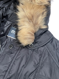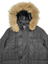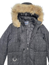 Jean Paul Gaultier quilted down parka with raccoon fur removable hood. Multiple pockets on front with branded metal D-loop on flap pocket. Double zip closure with buttoned placket. Branded snap button hardware. 100% nylon outer, down/duck feather inner, raccoon fur lining on hood. Made in China. Vintage, but in excellent condition. Fits a US small-medium. Measurements include down padding. Shoulders 18.5” Chest 21.5” Hem 22” Length 31.5” Sleeve 26”