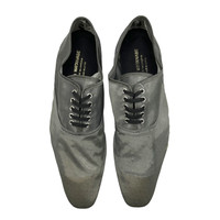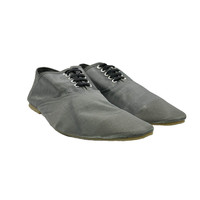 Junya Watanabe for Comme des Garçons nylon shoes in gray with a thin gum sole. Lightweight, nearly sheer fabric upper with a subtle cap toe. Lace-up closure with 5 metal eyelets. Insole with printed with designer name and country of origin. Unique leather dust bag with drawstring closure. 100% nylon upper. Made in Japan. Brand new with tags, box, and dust bag. Retail €300. Tagged a size M, fits a US ~8W