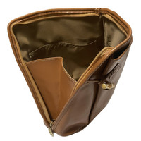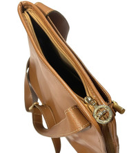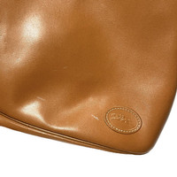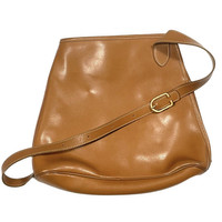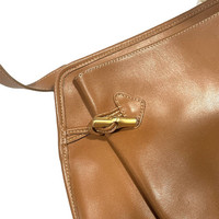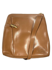 Longchamp Paris full grain amber-tanned leather bag. Branded gold-tone zipper closure with a duffle clasp fold-over pouch on front. 2 inner compartments with a natural leather tag. Adjustable shoulder strap with tonal stitching. Made in France. Approximate dimensions: 12” x 10” x 4” Vintage, with minor markings throughout. Flaws shown in pictures.