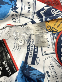 Karl Lagerfeld Paris short sleeve button down shirt with all-over French print. Short sleeves meant to be rolled with functional epaulets. Pearl-tone button closure with 2 button chest pockets. Darted rear. 100% polyester. Good condition. Tagged a size small, fits TTS 19” shoulder 19” chest 21” hem 5” sleeve 25” length