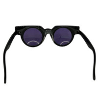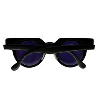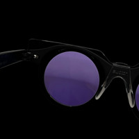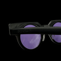 Swatch vintange 90's sunglasses in black with multicolor pattern front frame. Geometric purple/orange/black frame with purple lenses. Removable and replaceable front face on a plastic frame. Etched logo at temple. Made in Switzerland. Good vintage condition. Includes plastic carrying sleeve.