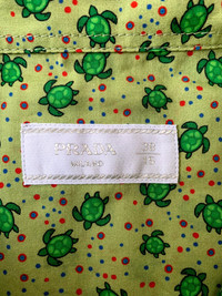 Button up shirt by Prada with a floral turtle all-over print. 2 chest pockets with button closures and button-down collar style. Long sleeve, slim cut. Made in Italy. Retail ~$650. New with tags. Tagged a size 38, fits a US small. 17” shoulders 20” chest 20” hem 26.5” sleeve 29” length