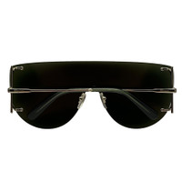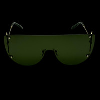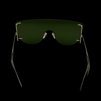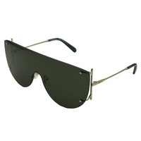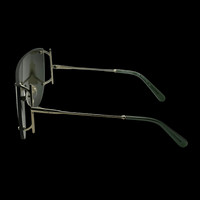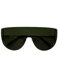 Savatore Ferragamo sunglasses in green and gold. Single oversized flat incognito lens with gold hardware at corners. Gold standoff buckle hinge with thin gold temples. Acetate-coated temple tips with debossed metallic branding. Ferragamo logo etched at temples. Made in Italy. Good condition; minor scratch on lens. Includes box, case, bag, and cleaning cloth.