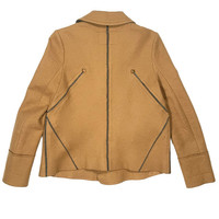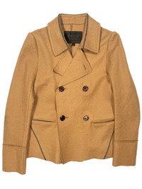 Jun Takahashi’s Undercover FW05 “Arts & Crafts” pea coat made of felt. Unreal construction, heat-treated adhesive seams with inset double-layer panels. Double-breasted 2 button closure with a button at the lapel. Vent holes on rear with contrast seams throughout. Made in Japan. Bonkers piece from an iconic collection. Some signs of wear with markings on right sleeve. Excellent structural condition. Shoulder 14.5” Chest 16.5” Hem 19” Sleeve 24” Length 25”