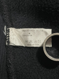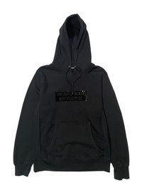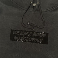 Undercover by Jun Takahashi graphic hoodie in black. “We make noise not clothes” motif shadow appliqué across chest. Kangaroo pocket on front, drawstring hood with metal eyelets. Ribbed cuffs, hem, and side panels. 100% cotton. Made in China. Good condition, signs of wear but no cracking to the graphic. Tagged a M, fits a US small 17.5” shoulder 19” chest 18” hem 25” sleeve 26” length