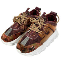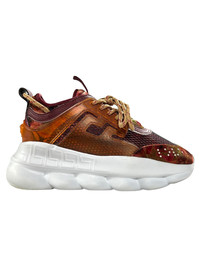 Versace Chain Reaction sneakers in burgundy velvet with a print toe cap and tongue. Translucent orange quarter overlay with a mesh upper covering printed fabric. Hiking boot laces with wax-covered aglets. Extra fixed lace running through heel tab. Embossed Medusa logo at heel. Ultra padded lining and tongue. Exaggerated chain patterned outsole with geometric Greek print on midsole. Insole padding reads “Chain Reaction” on top with a stamped Medusa head and logo on underside. Made in Italy. Great condition with some minor signs of wear. Retail $995. Tagged a size IT 38, fits a US 6M/7W