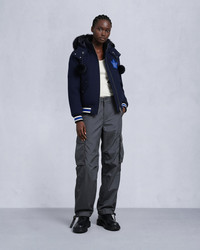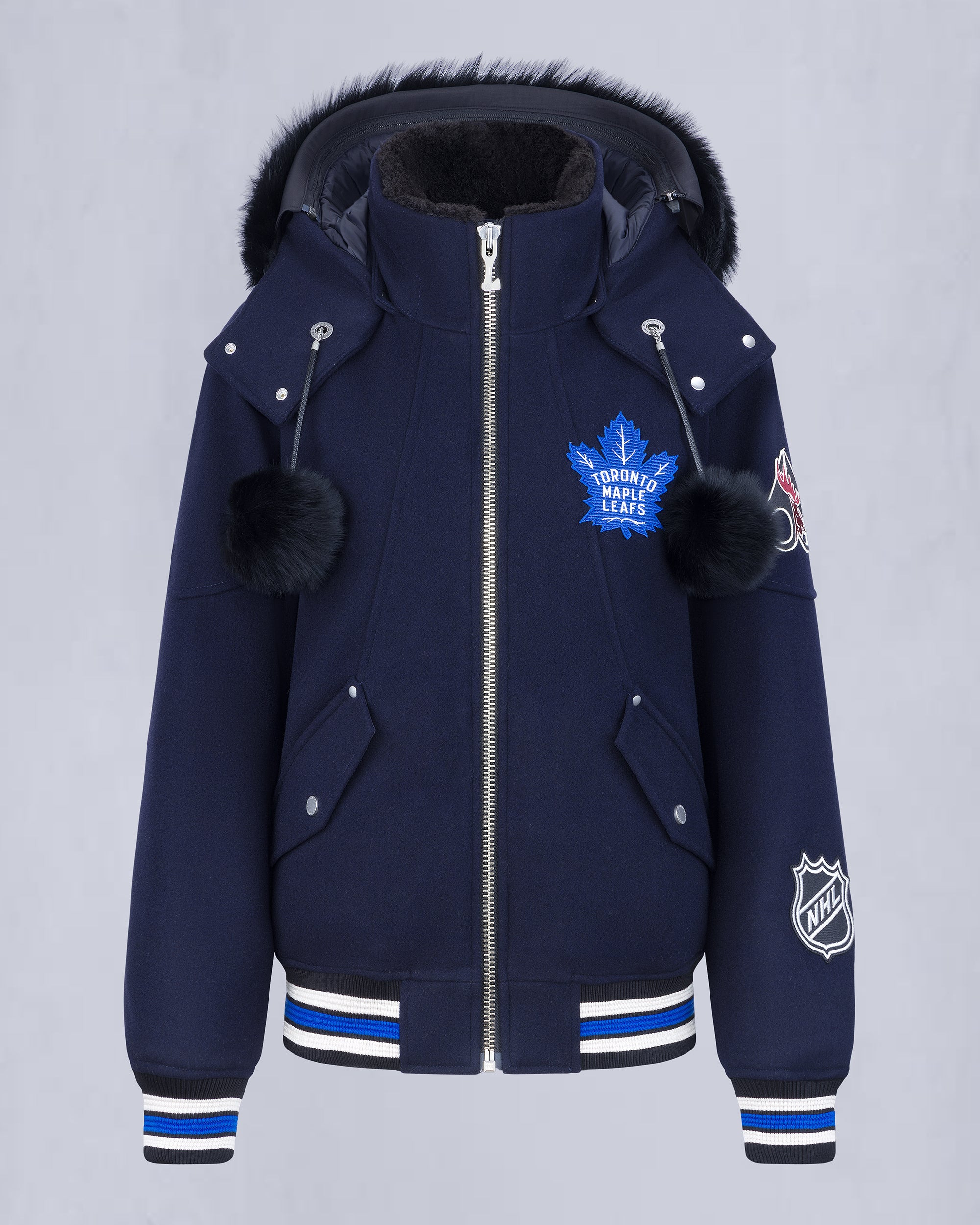 Celebrate the Toronto team with the exclusive NHL x Moose Knuckles Maple Leafs Bomber. High-performance engineering and cozy warmth meet hometown pride in this piece, which features the team's classic blue colorway. Size & Fit - Relaxed Fit : An easy and comfortable silhouette, cut with extra room on the body to allow for freedom of movement. It provides added shape, and it is comfortable. - 44"(112cm) Center Back Length. Measurement is done based on a Medium. Product Features Warmth & Protection - Protection Rating - Level 2: Cold – Your everyday winter workhorse. These garments will hold you down through the rain, sleet, hail and snow without overheating. - Genuine Sheep Shearling - Engineered in Canada, Water Repellent, Wind resistant Design & Function - Removable Hood with Removable Shearling Trim And Pom Poms - Sherpa Lined Collar - 1-Way Zipper - 2 Snap Pockets - Toronto Maple Leafs Patch, Moose Team Patch, NHL Patch SKU: 822185898568 Materials & Care Fill Responsible Down Standard Certified 90% Duck Down, 10% Feathers Composition - Body: 78% Wool, 22% Polyester - Lining: 100% Recycled Nylon - GRS-Certified, RDS-Certified Care Dry Clean Only Country of Origin Made in Vietnam