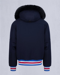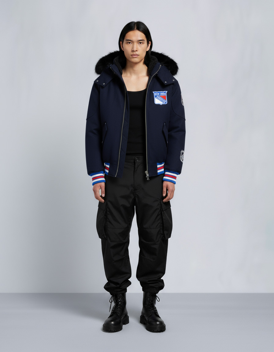 Celebrate the New York team in style with the exclusive NHL x Moose Knuckles Rangers Bomber. High-performance engineering and cozy warmth meet hometown pride in this piece, which features the team's classic blue colorway. Size & Fit - Relaxed Fit : An easy and comfortable silhouette, cut with extra room on the body to allow for freedom of movement. It provides added shape, and it is comfortable. - 26.5"(67cm) Center Back Length. Measurement is done based on a Medium. Product Features Warmth & Protection - Protection Rating - Level 2: Cold – Your everyday winter workhorse. These garments will hold you down through the rain, sleet, hail and snow without overheating. - Genuine Sheep Shearling - Engineered in Canada, Water Repellent, Wind resistant Design & Function - Removable Hood with Removable Shearling Trim - Sherpa Lined Collar - 1-Way Zipper - 2 Snap Pockets - New York Rangers Patch, Moose Team Patch, NHL Patch SKU: 822185898445 Materials & Care Fill Responsible Down Standard Certified 90% Duck Down, 10% Feathers Composition - Body: 78% Wool, 22% Polyester - Lining: 100% Recycled Nylon - GRS-Certified, RDS-Certified Care Dry Clean Only Country of Origin Made in Vietnam