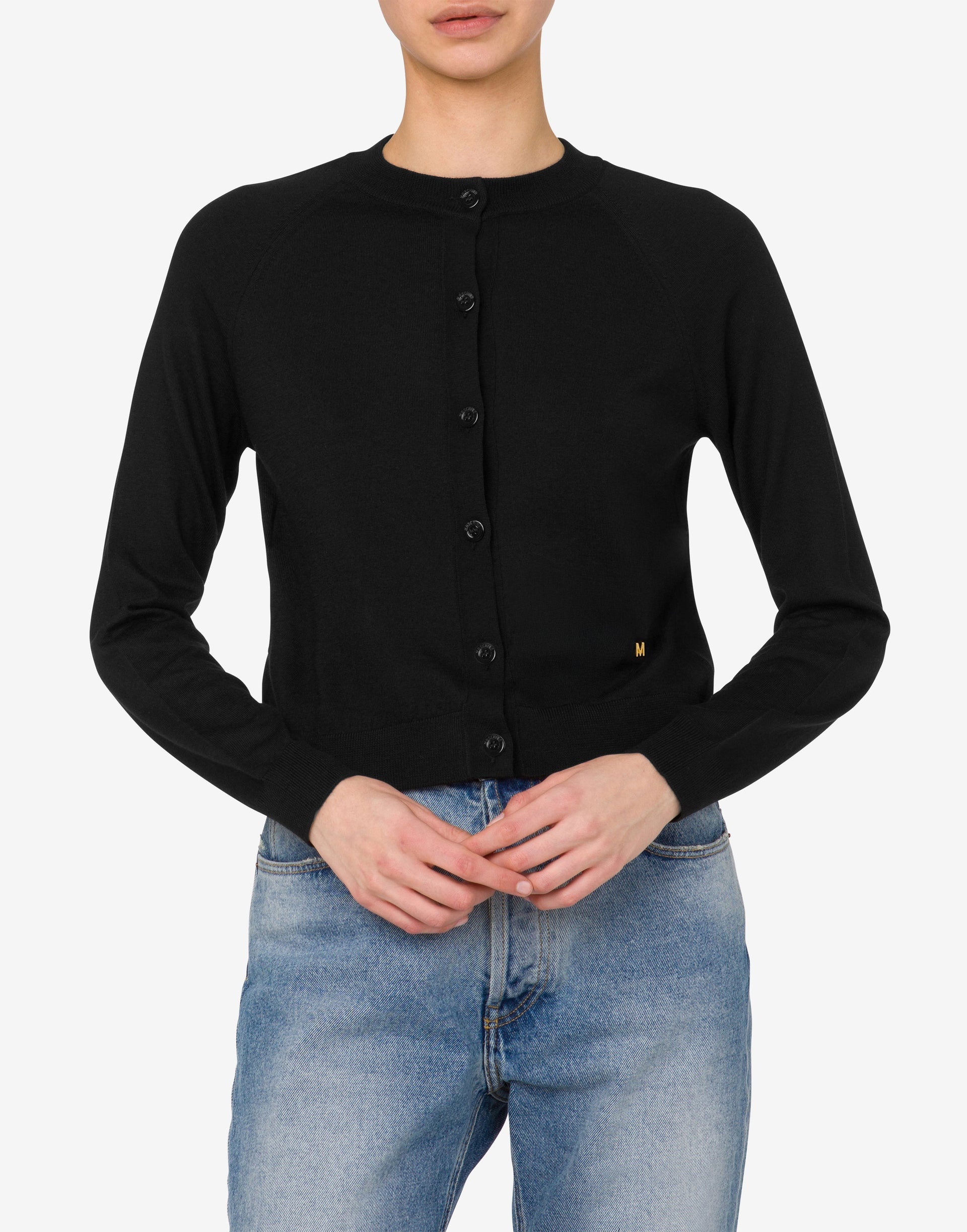 SHORT CARDIGAN IN ULTRAFINE WOOL AND SILK WITH SMALL GOLD-PLATED MOSCHINO LETTER M. PRODUCT DETAILS REGULAR FIT - METAL LETTER M - NECKLINE - BUTTON FRONT CLOSURE FABRIC: 70% PURE WOOL, 30% SILK SKU: AEF251E A093205010555 FITTING & DIMENSIONS - MODEL HEIGHT: 180 CM - MODEL BUST: 80 CM - MODEL WAIST: 60 CM - MODEL HIPS: 89 CM - MODEL SIZE: 40