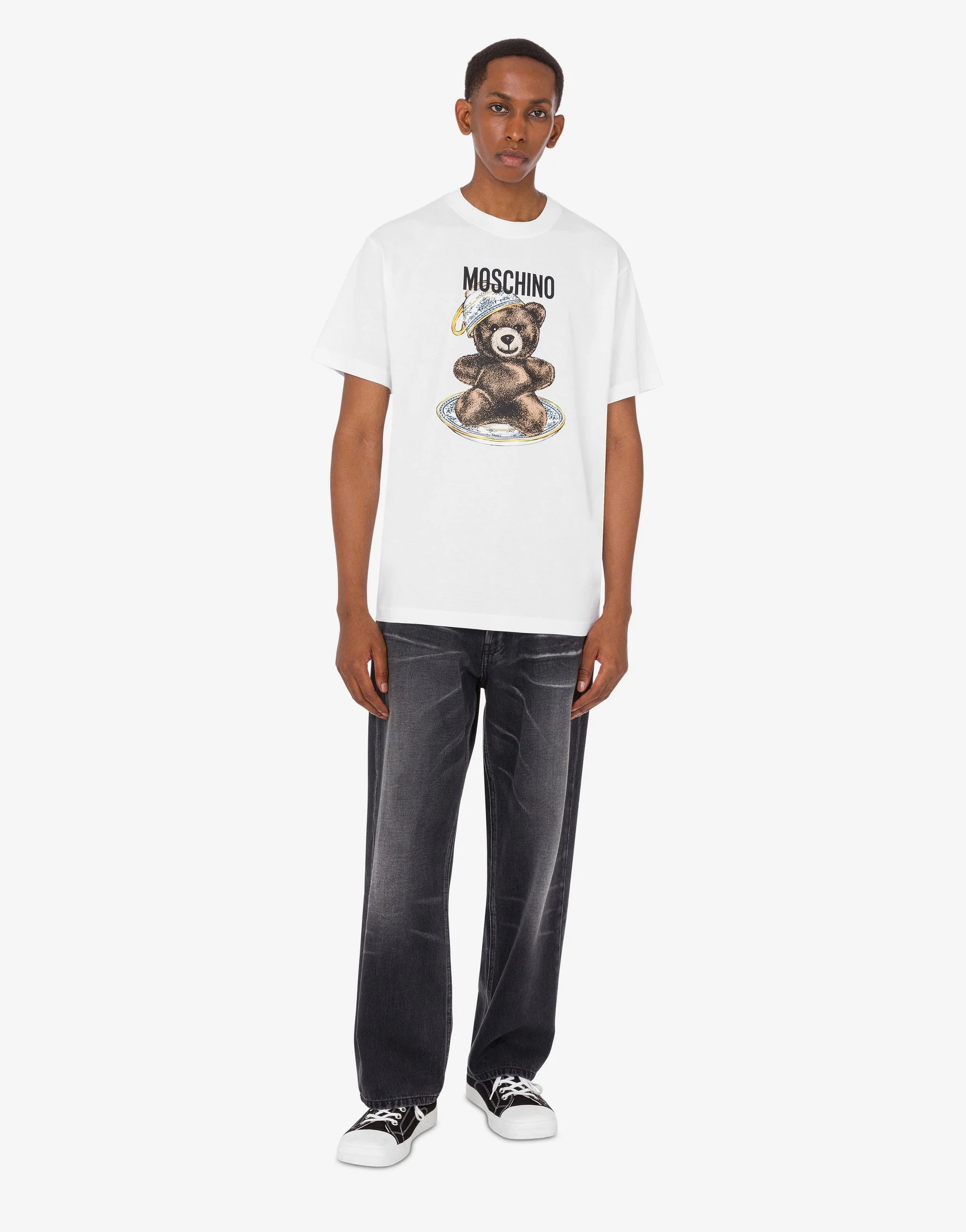THE FALL/WINTER 2025 COLLECTION FEATURES THE ORGANIC COTTON JERSEY T-SHIRT WITH MOSCHINO TEDDY BEAR PRINT ON THE FRONT. PRODUCT DETAILS REGULAR FIT - LOGO PRINT - SHORT SLEEVES FABRIC: 100% COTTON SKU: AEF252ZZV071652411001