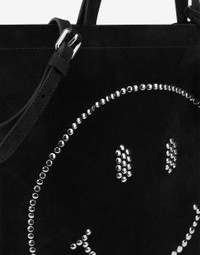 THE FALL/WINTER 2025 PRE-COLLECTION PRESENTS THE SUEDE TOTE BAG WITH SMILEY® MADE WITH SILVER-PLATED STUDS. PRODUCT DETAILS - MADE IN COLLABORATION WITH SMILEY® - METAL STUDS - DOUBLE HANDLES FOR SHOULDER CARRY - REMOVABLE LOGO CHARM - MAGNETIC CLOSURE - LINED INTERIOR WITH ZIP POCKET AND SMALL PATCH POCKET UPPER: 100% CALFSKIN - LINING: 100% COTTON SKU: POLMC4040PP1NOF000B FITTING & DIMENSIONS - DEPTH: 1 CM - WIDTH: 38 CM - HEIGHT: 42 CM