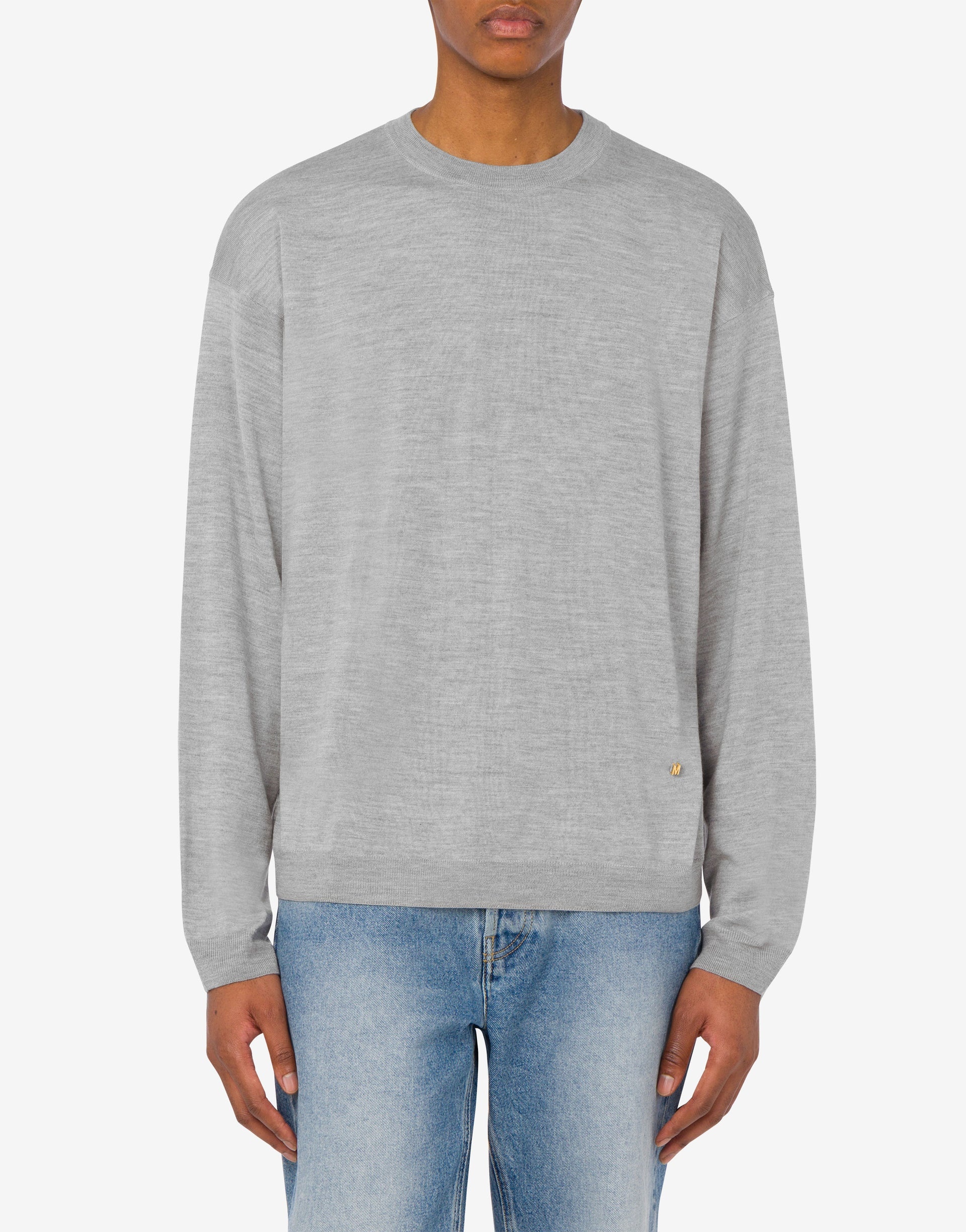 FINE WOOL AND SILK PULLOVER WITH MINI MOSCHINO M IN GOLD GALVANIC. PRODUCT DETAILS RELAXED FIT - METAL LETTER M - CREW NECK - DROPPED SHOULDERS FABRIC: 70% PURE WOOL, 30% SILK SKU: AEF251ZZJ090702010486 FITTING & DIMENSIONS - MODEL HEIGHT: 185 CM - MODEL BUST: 103 CM - MODEL WAIST: 84 CM - MODEL HIPS: 104 CM - MODEL SIZE: 48