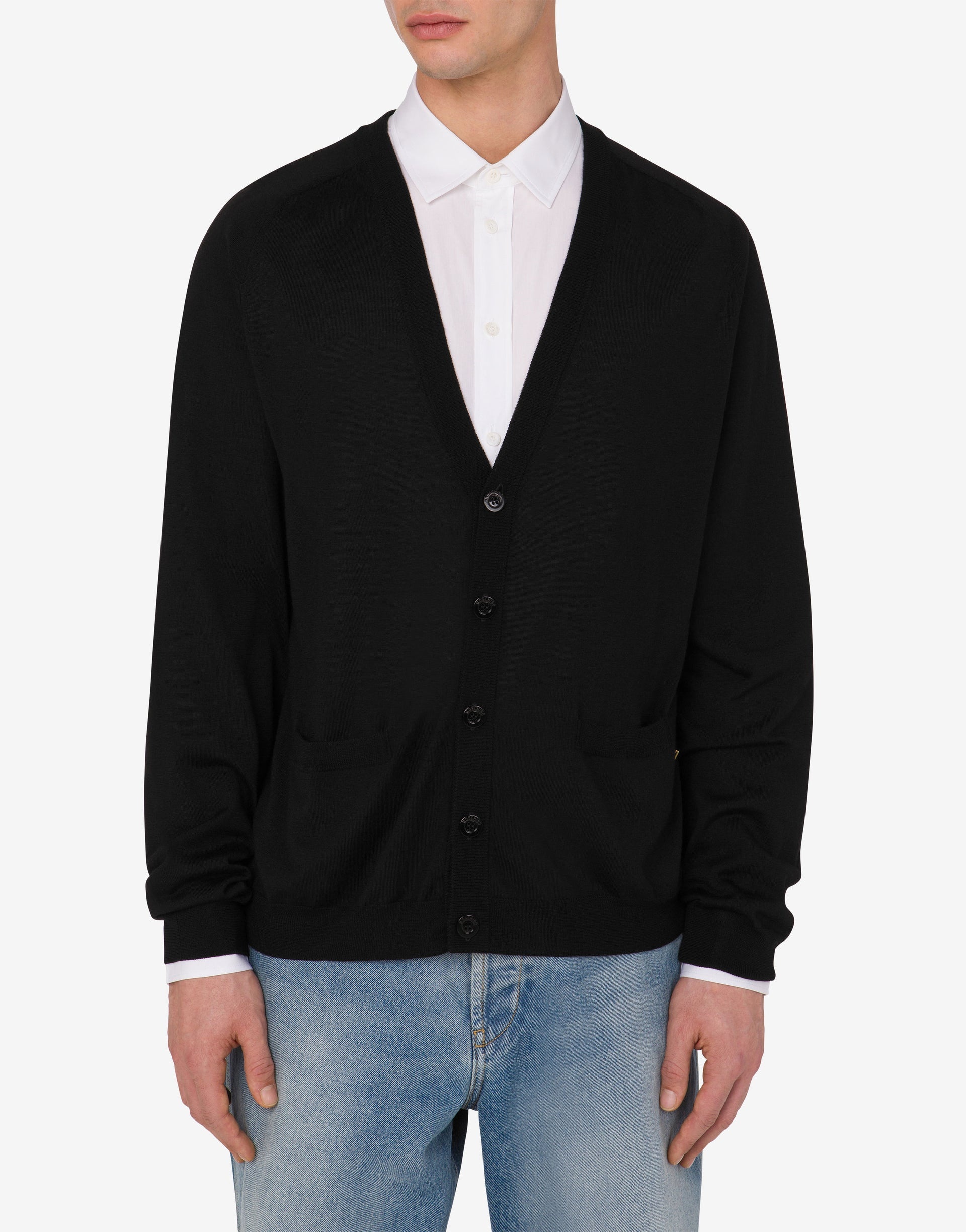 FINE WOOL AND SILK CARDIGAN WITH MINI MOSCHINO M IN GOLD GALVANIC. PRODUCT DETAILS - METAL LETTER M - V-NECK - TWO FRONT POCKETS - FRONT BUTTON CLOSURE FABRIC: 70% PURE WOOL, 30% SILK SKU: AEF251ZZJ090502010555 FITTING & DIMENSIONS - MODEL HEIGHT: 185 CM - MODEL BUST: 103 CM - MODEL WAIST: 84 CM - MODEL HIPS: 104 CM - MODEL SIZE: 48