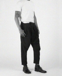 Bought with the intention of wearing it but never did, basically brand new condition. Dropped crotch and tapered leg from the knee down. See additional photos for sizing chart. CONTENTS: 98% COTTON TWILL/2% SPANDEX TRADITIONAL JAPANESE WORKWEAR SINCE 16TH CENTRY (AZUCHI-MOMOYAMA PERIOD) TAPERED SAROUEL PANTS SILHOUTTE