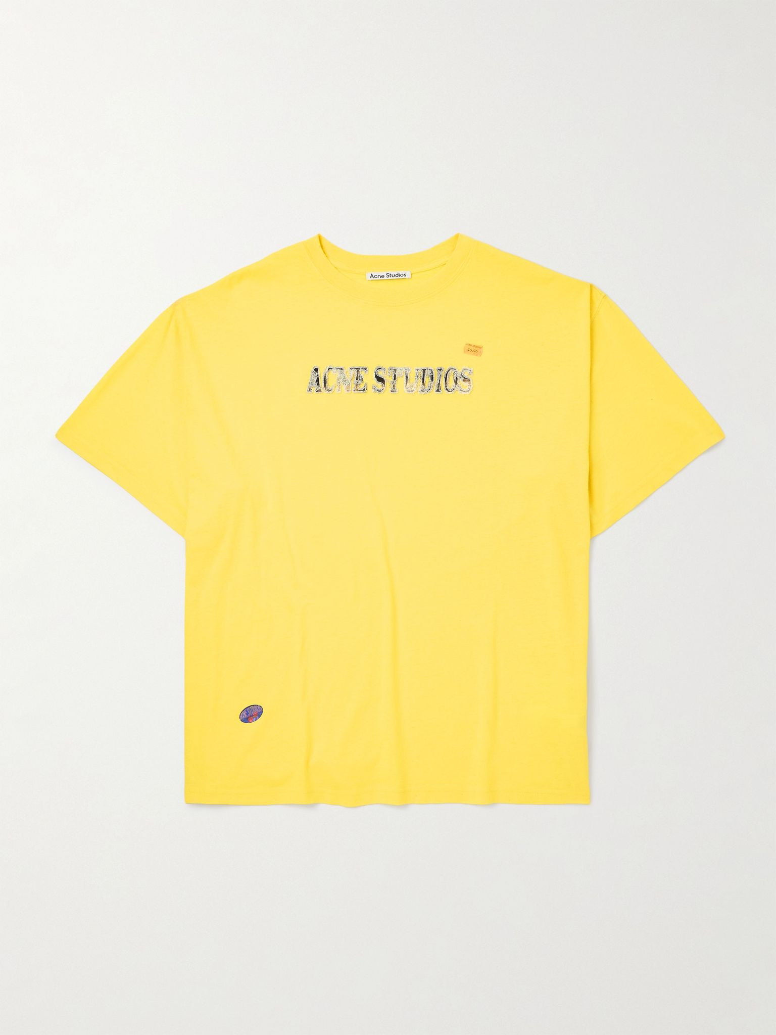 Don't fall for the sticker price on Acne Studio's tongue-in-cheek T-shirt. Cut from cotton-jersey, it's appliqued with the supermarket decal placed off-centre, followed by distressed lettering across the chest. Size & Fit - Intended to be oversized; we recommend sizing down if you prefer a closer fit - Dropped shoulder seam - Lightweight, slightly stretchy fabric - Model is shown wearing a M - Model measures: chest 38"/ 96cm, height 6'2"/ 188cm Details & Care - Yellow cotton and hemp-blend jersey - 85% cotton, 15% hemp - Machine wash