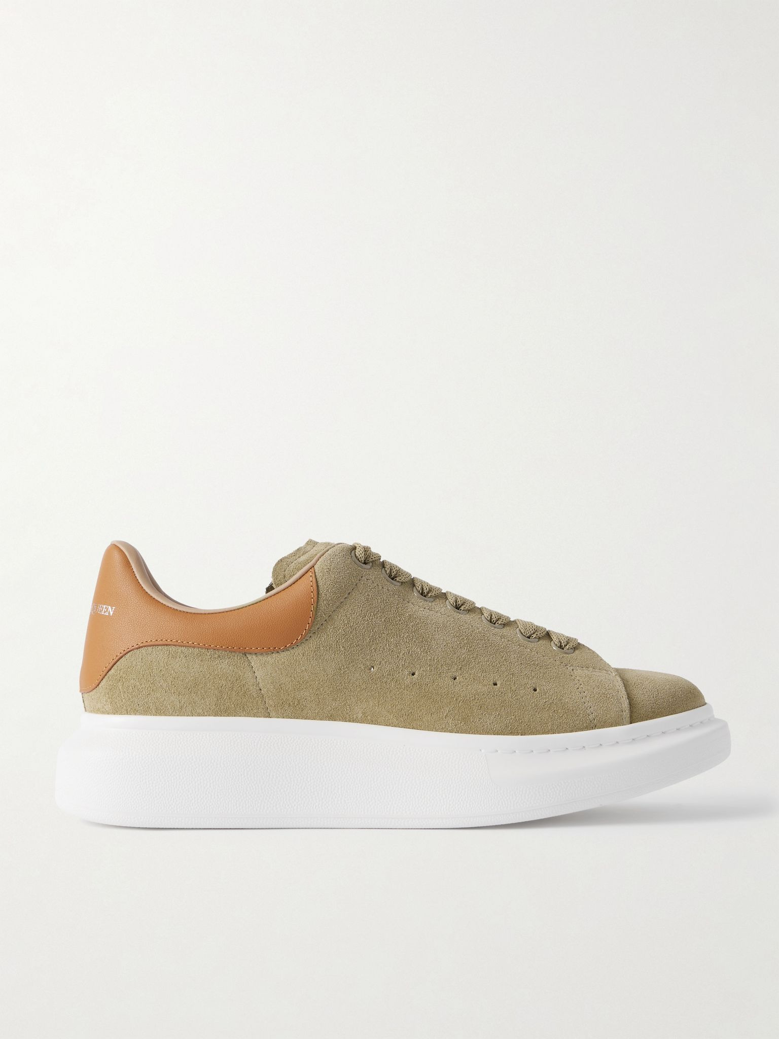 Alexander McQueen's sneakers need no introduction – they've been popular since 2016. This leather-trimmed pair has been made in Italy and features signature chunky rubber soles. Size & Fit - Fits true to size. Take your normal size - European sizing Details & Care - Mushroom suede, tan leather (Calf) - Lace-up - Style number: 553680WIAGL