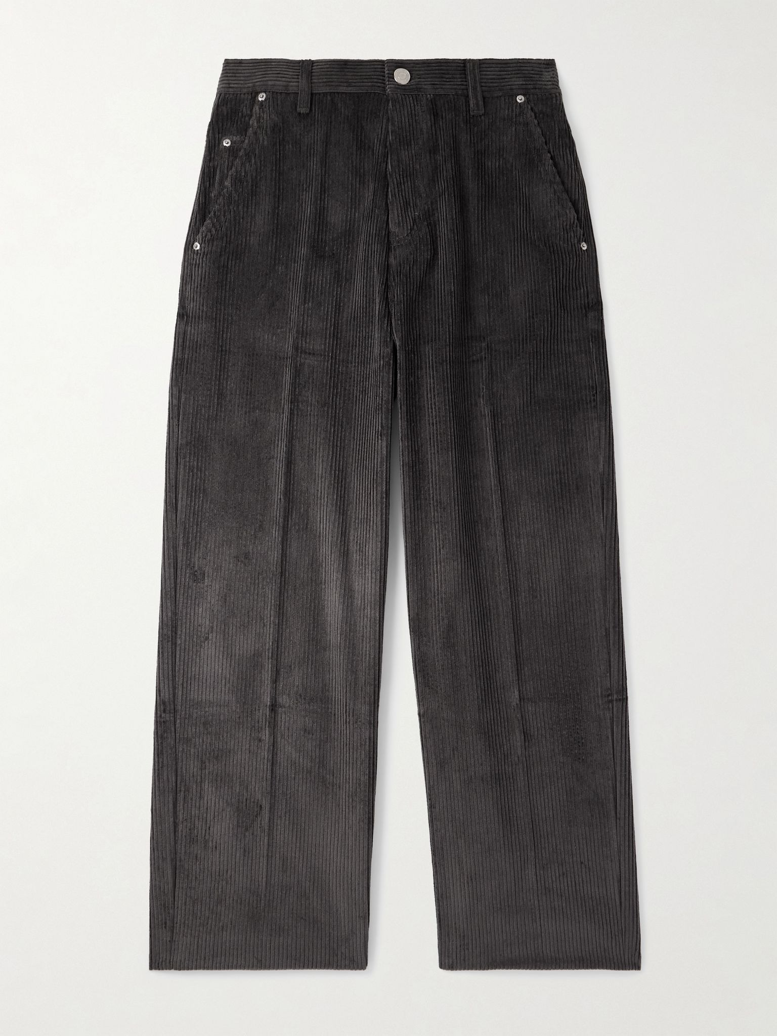 AMI PARIS' trousers are made from cotton-corduroy, which has a velvety texture and soft lustre. They're cut quite wide and detailed with silver-tone rivets and a leather back patch, like traditional jeans. Team yours with loafers or sneakers. Size & Fit - Fits true to size. Take your normal size - Wide leg, low-crotch style - Mid-weight, non-stretchy fabric - Model is shown wearing an IT 48 - Model measures: waist size 32, height 6'0"/ 183cm Details & Care - Black cotton-corduroy - Button fastenings - 100% cotton - Machine wash