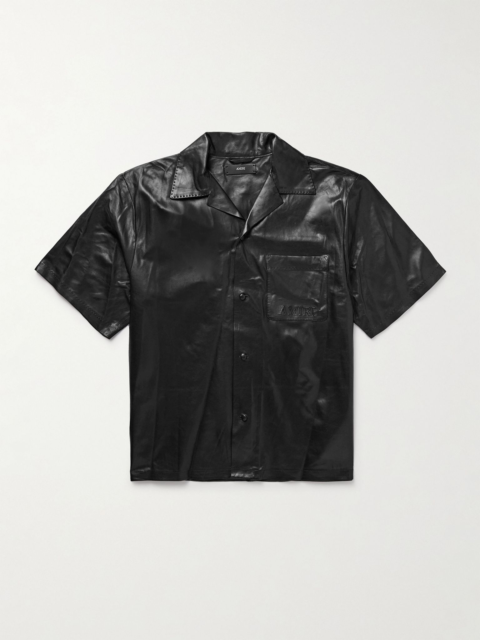 Camp-Collar Logo-Embossed Leather Shirt Black