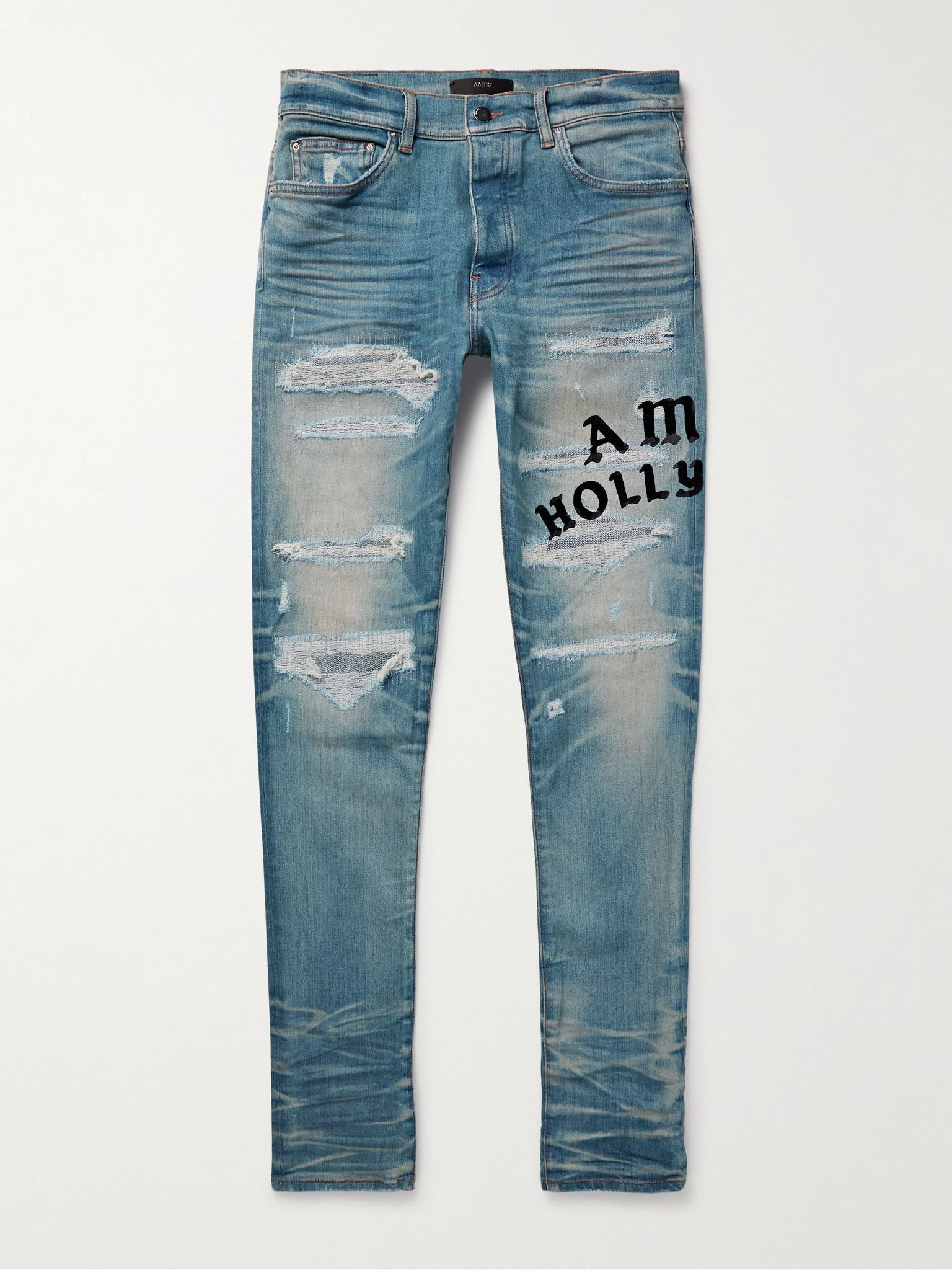 AMIRI's 'Hollywood' jeans pay homage to the brand's Los Angeles roots with a fuzzy flocked logo across one thigh. In a signature skinny fit, they're made from soft Italian stretch-denim, specially treated for a faded effect and thoroughly distressed by hand. Small to size. See Size & Fit notes. Size & Fit - Fits small to size. Take one size larger than normal - Skinny leg, mid-rise style - Mid-weight, stretchy fabric - Model is shown wearing a 33 - Model measures: waist size 32, height 6'1"/ 185cm Details & Care - Blue stretch-denim - Button fastenings - 92% cotton, 6% elastomultiester, 2% elastane; trim: 100% cotton - Designer wash: Honeycomb Indigo