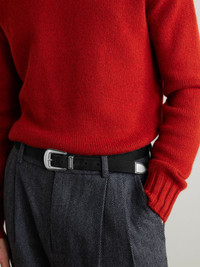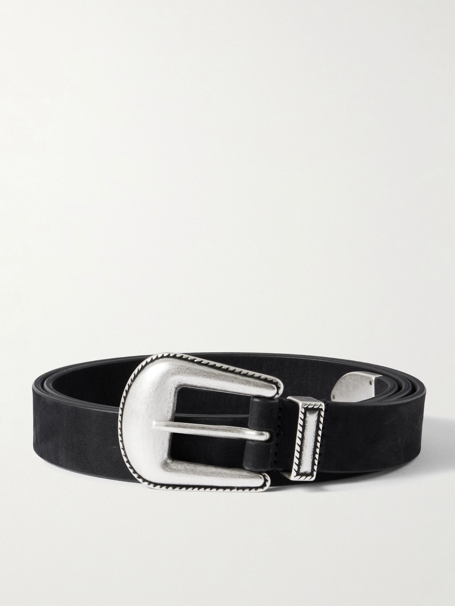 Anderson's belt is fitted with a Western-style buckle, complete with rope-detailed edges. It's made from premium nubuck, which has a velvety softness but is also highly durable. Lower Impact Materials. This product is made using at least 50% lower-impact materials or ingredients. Find out more about our Consciously Crafted criteria here. Size & Fit - Fits true to size. Take your normal size - Model is shown wearing a 90 - Model measures: waist size 30 Details & Care - Black nubuck (Calf) - Silver-tone buckle fastening - Comes with presentation box - By purchasing this product, you are supporting responsible leather manufacturing through Leather Working Group.