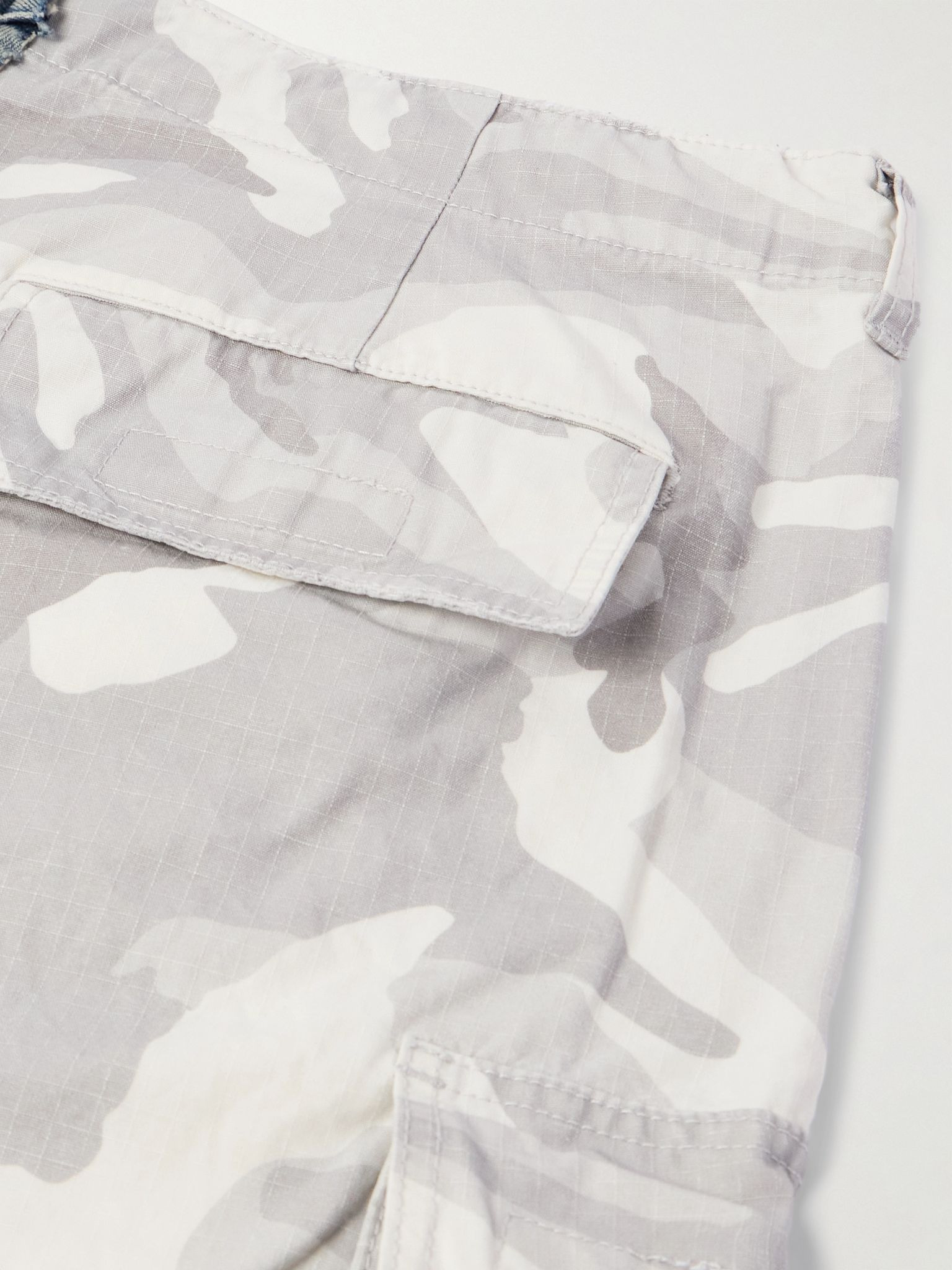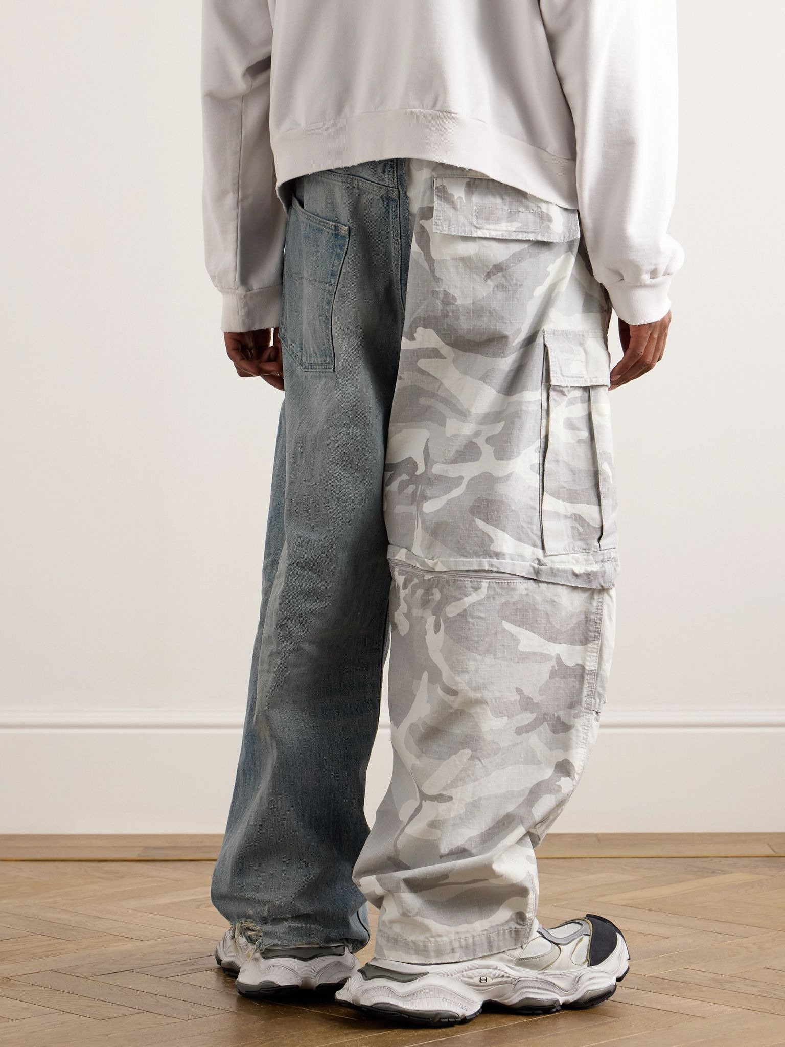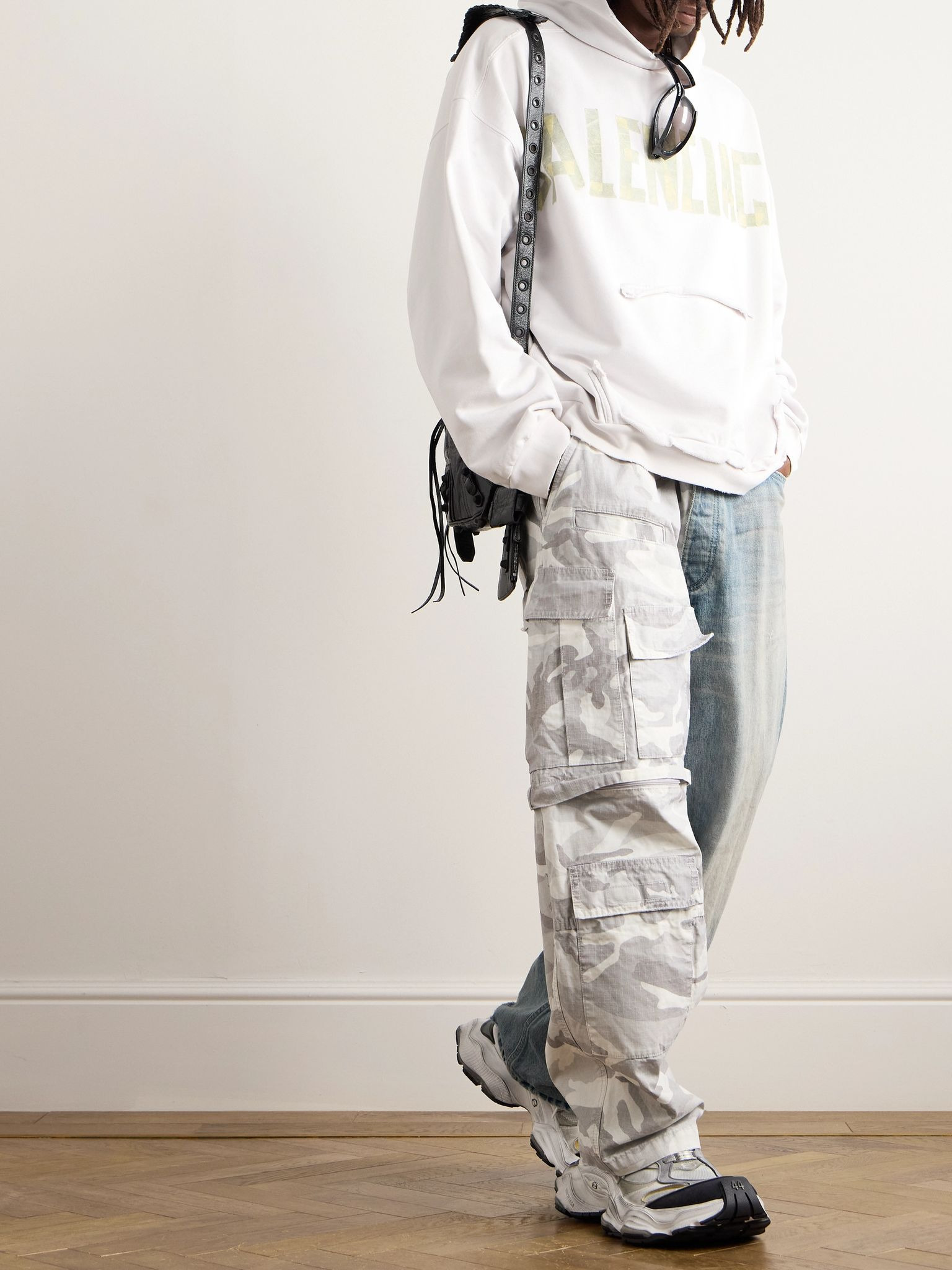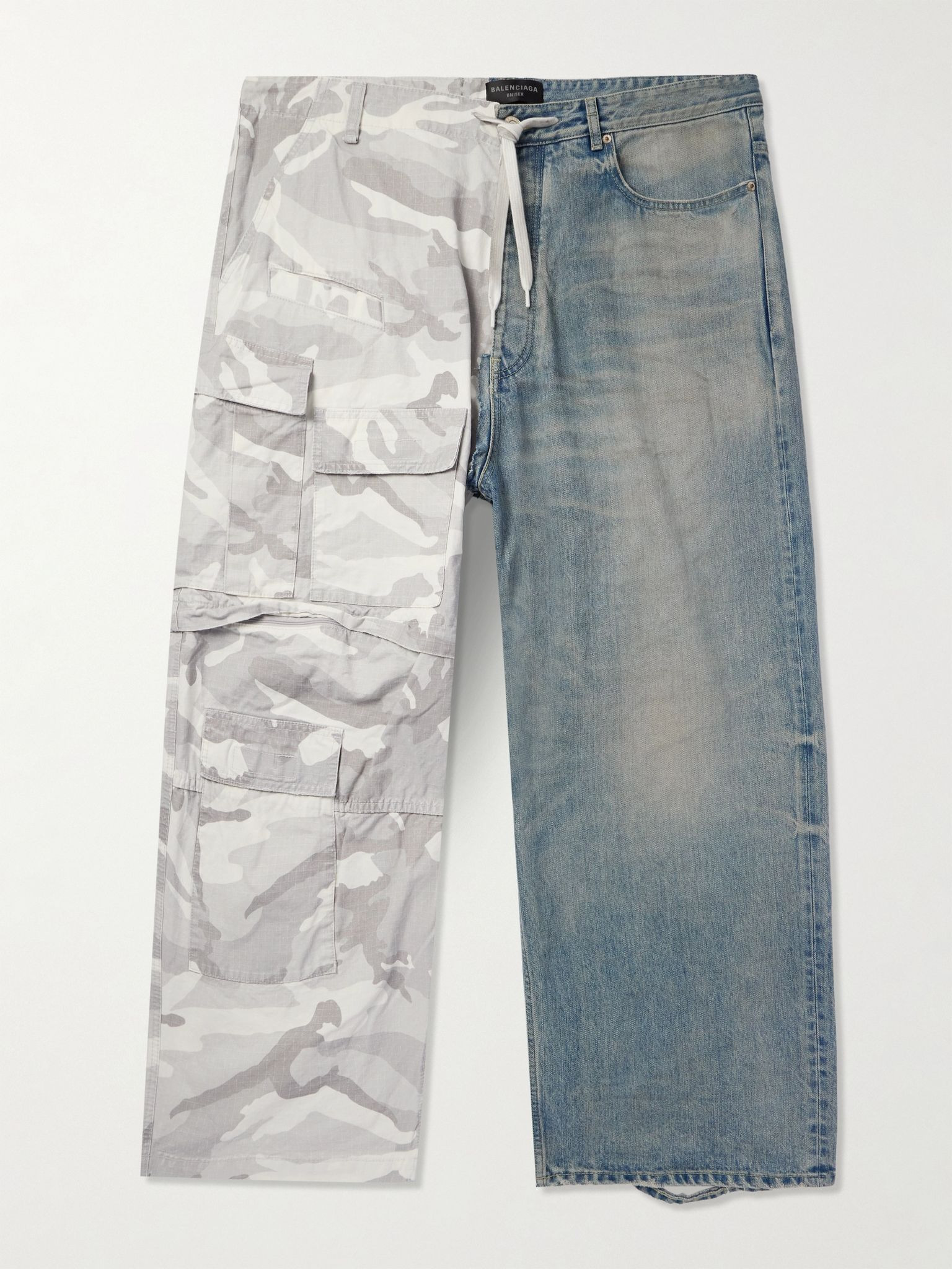 Demna looked to '00s celebrity street style as inspiration for Balenciaga's AW24 collection. A hybrid between jeans and cargos, these trousers are made from panels of camouflage-print cotton-ripstop and distressed selvage denim. They're cut for a baggy, wide-leg fit and have a drawstring waistband that references skate culture. Large to size. See Size & Fit notes. Size & Fit - Fits large to size. Take one size smaller than normal - Wide leg, low-crotch style - Mid-weight, non-stretchy denim - Model is shown wearing a S - Model measures: waist size 32, height 6'0"/ 183cm Details & Care - Tonal-grey and white cotton-ripstop, blue denim - Button fastenings - 100% cotton - Machine wash