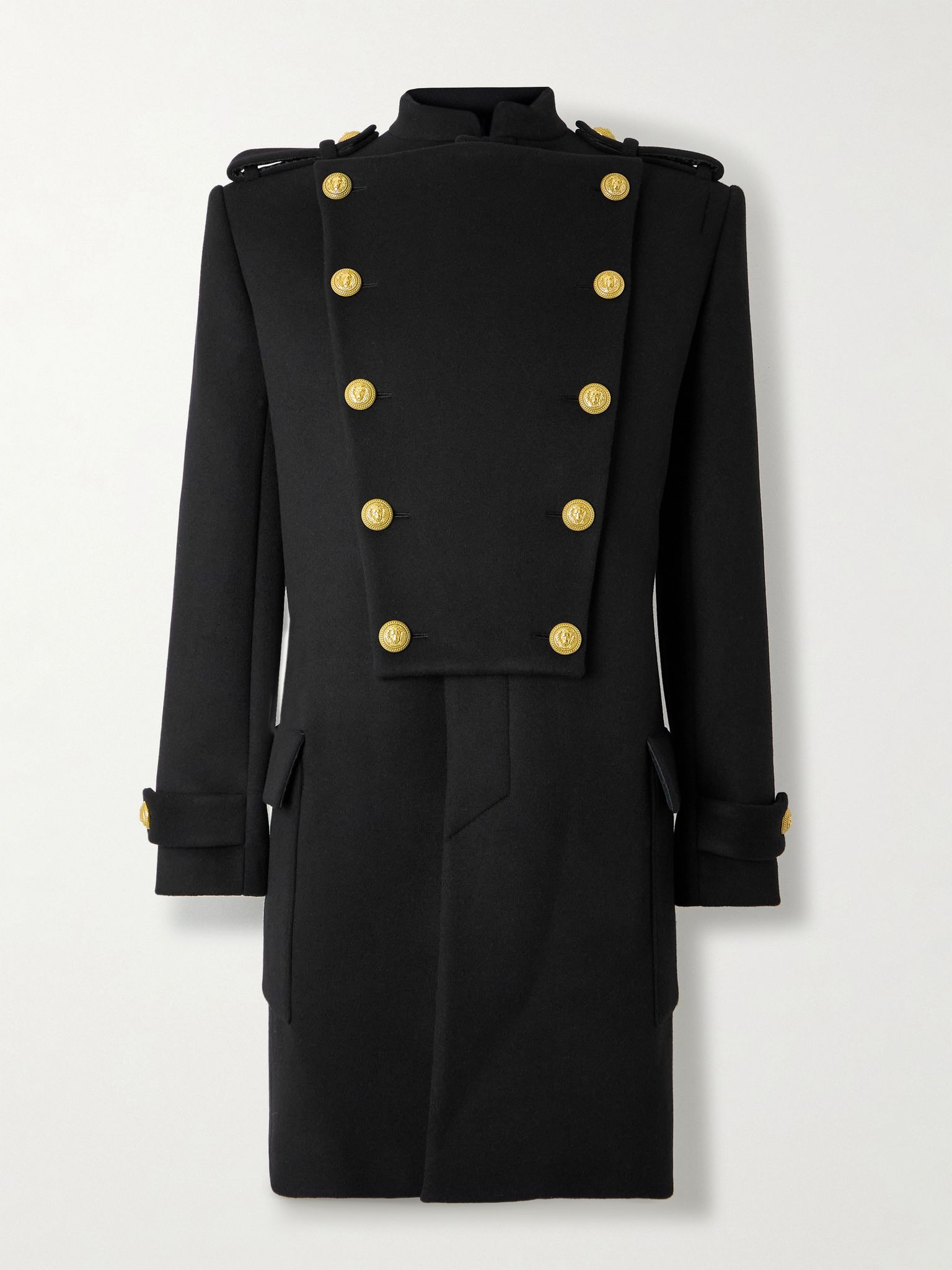 Balmain's military influence is perfectly illustrated in this officer's coat. It's tailored from a luxe blend of wool and cashmere and has a detachable button-embellished bib for a more understated look. Size & Fit - Fits true to size. Take your normal size - Tailored for a regular fit - Internal shoulder pads - Weighted, non-stretchy fabric - Model is shown wearing an IT 48 - Model measures: chest 38"/ 96cm, height 6'0"/ 183cm Details & Care - Black wool and cashmere-blend - Double-breasted button fastenings - 90% wool, 10% cashmere - Dry clean