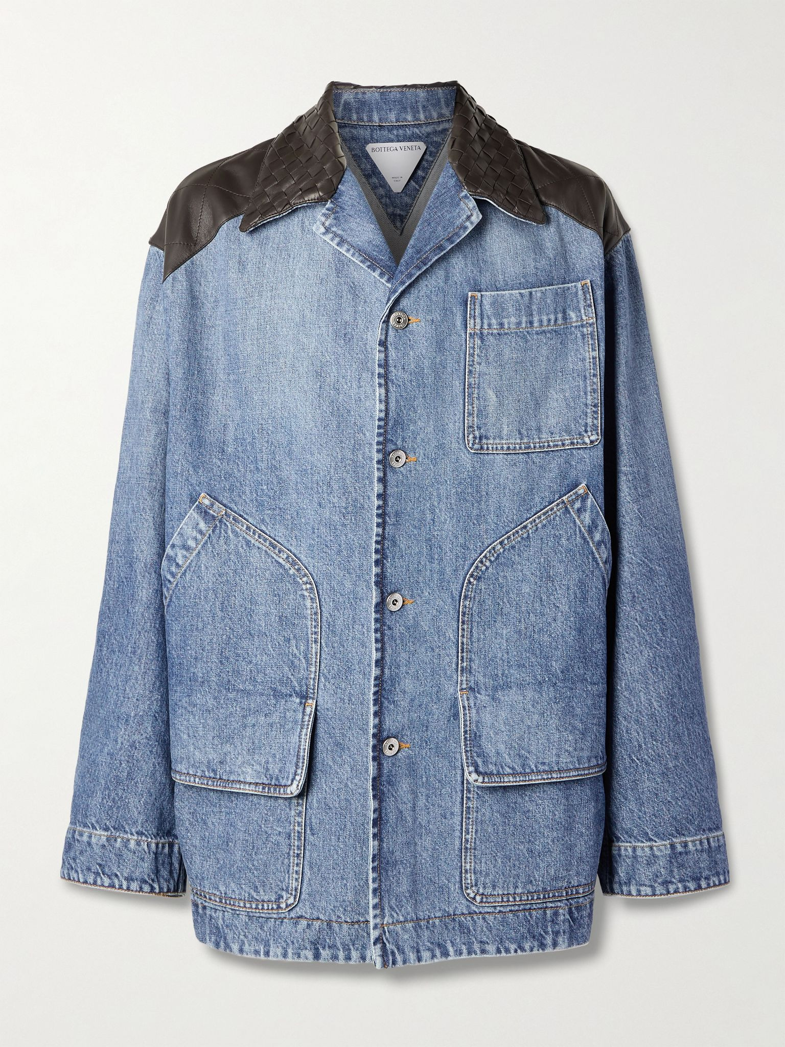 Intrecciato Leather-Panelled Denim Jacket Blue