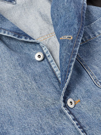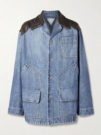 Bottega Veneta's jacket is panelled with the signature intrecciato leather along the collar and shoulders. Constructed with contrast topstitching, it's made from denim that's faded for a vintage feel and has a relaxed shape with curved side pockets. The silver-tone buttons are embossed with the house logo. Size & Fit - Intended to be oversized; we recommend sizing down if you prefer a closer fit - Mid-weight, non-stretchy denim - Model is shown wearing an IT 46 - Model measures: chest 36"/ 92cm, height 6'3"/ 191cm Details & Care - Blue denim, brown leather - Button fastenings - 100% cotton; trim: 100% leather - Dry clean