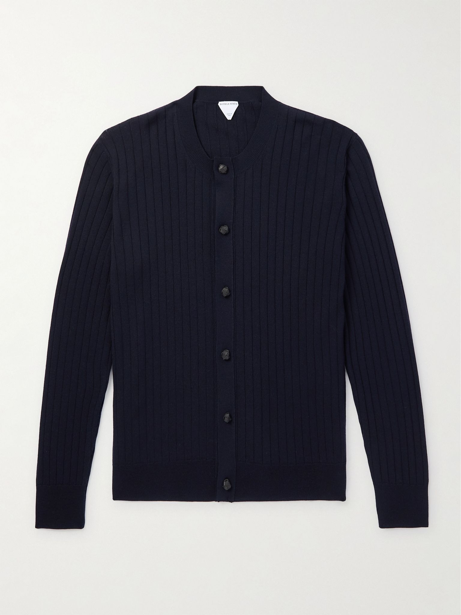 The leather buttons on Bottega Veneta's cardigan are woven using the house's signature intrecciato technique. Made from wool, it has a relaxed shape with a round neck and a tactile ribbed finish. Layer yours over a fresh white tee. Size & Fit - Fits true to size. Take your normal size - Designed for a relaxed fit - Fine knit - Model is shown wearing a S - Model measures: chest 36"/ 92cm, height 6'3"/ 191cm Details & Care - Midnight-blue wool - Button fastenings - 100% wool