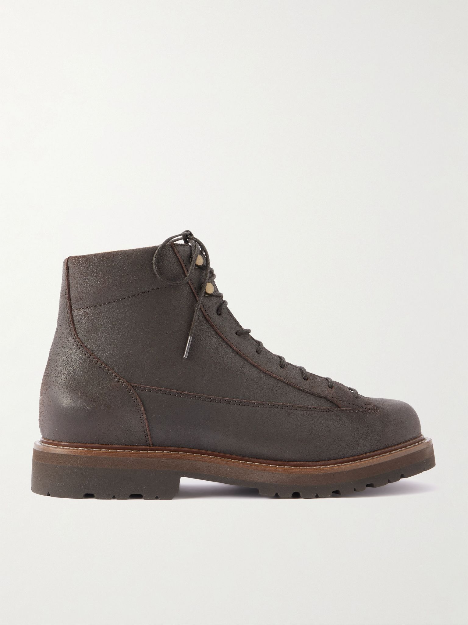 Brunello Cucinelli’s hiking boots balance rugged function with the brand’s signature sophistication. They're crafted from waxed suede and set on sturdy lug soles. Size & Fit - Fits true to size. Take your normal size - European sizing Details & Care - Brown waxed-suede (Calf) - Lace-up