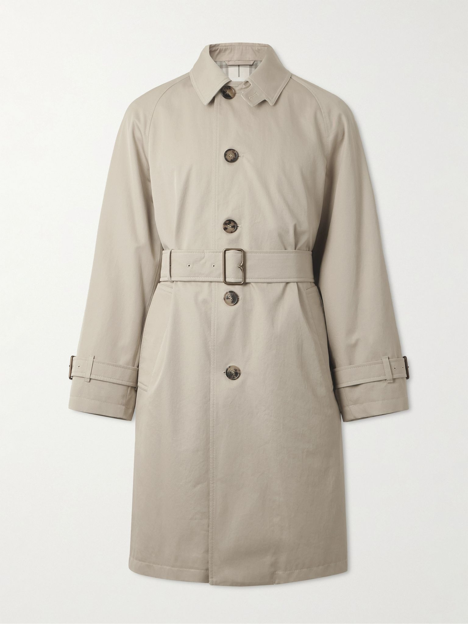 When it comes to trench coats, you won't find much more classic than Burberry – introduced by the founder in 1879, the cotton-gabardine fabric is naturally water-repellent to protect you from the elements. This style is cut in a straight shape and detailed with all the traditional hallmarks, like a belted waist, adjustable cuffs and a throat latch for turning up the collar. Size & Fit - Fits true to size. Take your normal size - Designed for a slightly loose fit; use the belt to secure at the waist - Mid-weight, non-stretchy fabric - Model is shown wearing an IT 48 - Model measures: chest 38"/ 96cm, height 6'2"/ 188cm Details & Care - Grey cotton-gabardine - Button fastenings - 100% cotton; lining: 100% viscose; buttons: 100% horn (Buffalo) - Dry clean
