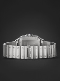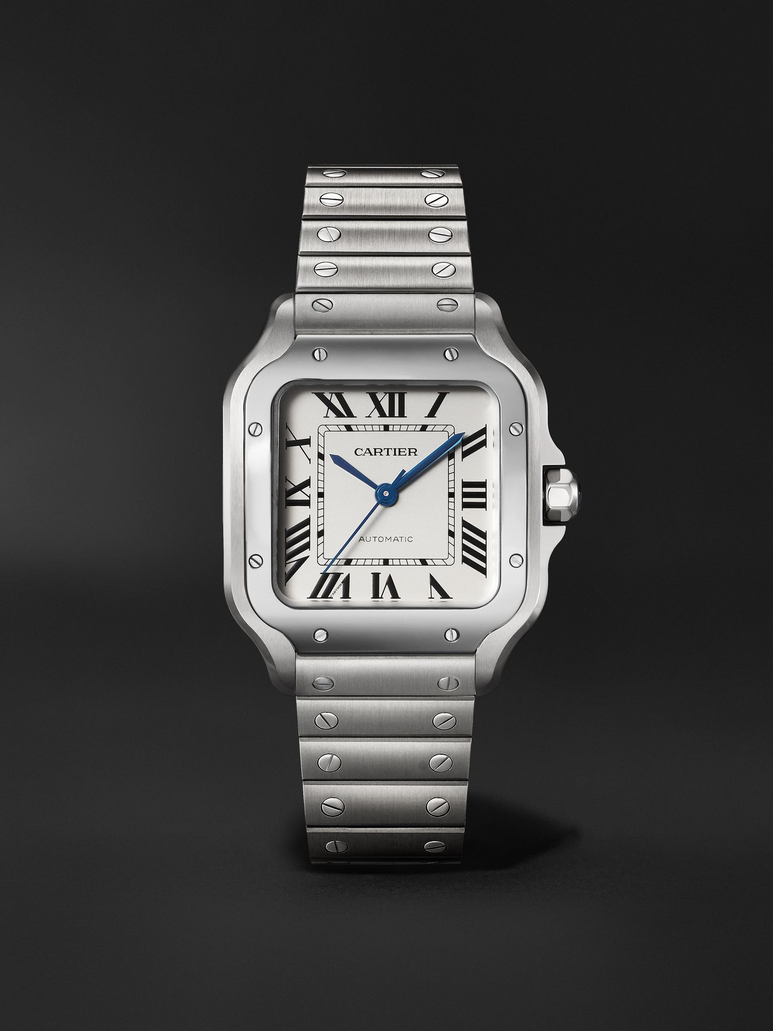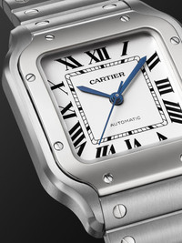 Brazilian aviator Alberto Santos-Dumont called upon his friend and master jeweller Louis Cartier to create a timepiece that could be used in-flight. More than 100 years on, the 'Santos' model is one of the most iconic and elegant watches around. This version has a 35.1mm case crafted from polished stainless steel and is fitted with an opalescent dial detailed with blue steel sword-shaped hands and Roman numerals. It's finished with an angular seven-sided crown encrusted with a faceted sapphire and has interchangeable metal and leather straps – the innovative 'QuickSwitch' feature allows you to swap them yourself depending on the occasion. For warranty information, please refer to details & care Details & Care Movement - Swiss-made automatic calibre 1847 MC movement with 42-hour power reserve - 23 jewels, 28,800 Vph Functions - Hour, minute and second hands Dial - Silvered opaline dial Case - Stainless steel case - Blue spinel crown for time adjustments and manual winding - Scratch-resistant sapphire glass crystal - Folding clasp-fastening steel bracelet; additional buckle-fastening brown leather strap Specifications - Case diameter: 35.1mm; case thickness: 8.83 mm - Water resistance: 10 bar - Comes in a presentation box - Reference number: CRWSSA0029 We offer a two-year warranty for all working parts and manufacturing faults for luxury watches. For more information, contact one of our experts by emailing watches@mrporter.com