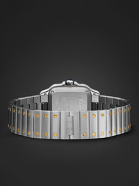Louis Cartier made horological history in 1904 when he created the first wristwatch for his friend, Brazilian aviator Alberto Santos Dumont, to check the time while flying. Designed with the same rounded edges and exposed screws as the original, this small version has been made in Switzerland from polished stainless steel and 18-karat gold. The innovative 'QuickSwitch' feature allows you to easily swap out the bracelet for the midnight-blue leather strap, depending on your mood or the occasion. For warranty information, please refer to details & care Details & Care Movement - Swiss-made quartz movement Functions - Hour and minute hands Dial - Silver sunray dial - Blued steel sword-shaped hands, black Roman numerals and markers Case - Stainless steel and 18-karat gold case - Crown with blue cabochon for time adjustments - Sapphire glass crystal - Engraved case back - Interchangeable QuickSwitch folding clasp-fastening bracelet; additional buckle-fastening midnight-blue leather (Calf) strap Specifications - Case length: 34.5mm; case width: 34.5mm; case thickness: 7.08mm - Water resistance: 3 bar - Comes in a presentation box - Reference number: W2SA0033 We offer a two-year warranty for all working parts and manufacturing faults for luxury watches. For more information, contact one of our experts by emailing watches@mrporter.com