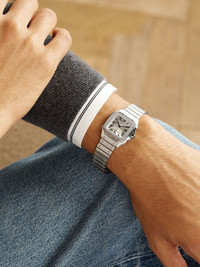 When Brazilian aviator Alberto Santos-Dumont tasked Louis Cartier to create a timepiece he could wear while flying, he set the precedent for modern watchmaking. Named in his honour, this model is crafted from stainless steel with a sleek black bezel and is driven by a precise quartz movement. Use the innovative 'QuickSwitch' system to swap between the bracelet and leather strap. For warranty information, please refer to details & care Details & Care Movement - Quartz movement Functions - Hour and minute hands Dial - Silver sunray dial - Blued steel sword-shaped hands, black Roman numerals and indices Case - Stainless steel case - Black bezel - Blue spinel crown for date and time adjustments and manual winding - Sapphire glass crystal - Engraved case back - Folding clasp-fastening bracelet; additional buckle-fastening blue leather strap (Calf) Specifications - Case length: 34.5mm; case width: 27mm; case thickness: 7.08mm - Water resistance: 3 bar - Comes in a presentation box - Reference number: CRWSSA0082 We offer a two-year warranty for all working parts and manufacturing faults for luxury watches. For more information, contact one of our experts by emailing watches@mrporter.com