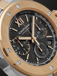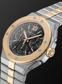 Those with an eagle eye for horology will notice that the eight bezel screws and ingot-shaped bracelet links of Chopard's watch are lifted from the maison's 1980s 'St. Moritz' model. Inspired by the original with a few key updates, this automatic 'Alpine Eagle' is built from a combination of 18-karat rose gold and Chopard's proprietary Lucent Steel A223, which it spent four years developing. It has a galvanised dial with a trio of chronograph counters and extra strength Super-LumiNova® Grade X1. We offer a two-year warranty for all working parts and manufacturing faults for luxury watches. For more information, contact one of our experts by emailing watches@mrporter.com Details & Care Movement - Swiss-made calibre Chopard 03.05-C automatic chronograph movement with 60-hour power reserve - 45 jewels, 28,800 Vph Functions - Hour, minute and second hands - Date window - Flyback chronograph: small seconds, 30-minute and 12-hour counters, jumping minute counter - Tachymeter scale Dial - Galvanised Pitch black sunburst dial - Gold-plated Super-LumiNova® hands, Roman numerals and indices Case - Lucent steel and 18-karat rose gold case - Crown for date and time adjustments and manual winding - Sapphire glass crystal - Exhibition case back - Folding clasp-fastening Lucent steel and 18-karat rose gold bracelet Specifications - Case diameter: 44mm; case thickness: 13.15mm - COSC-certified chronometer - Water resistance: 10 bar - Comes in a presentation box - This piece has been certified in accordance with the Hallmarking Act 1973 - Reference number: 298609-6001