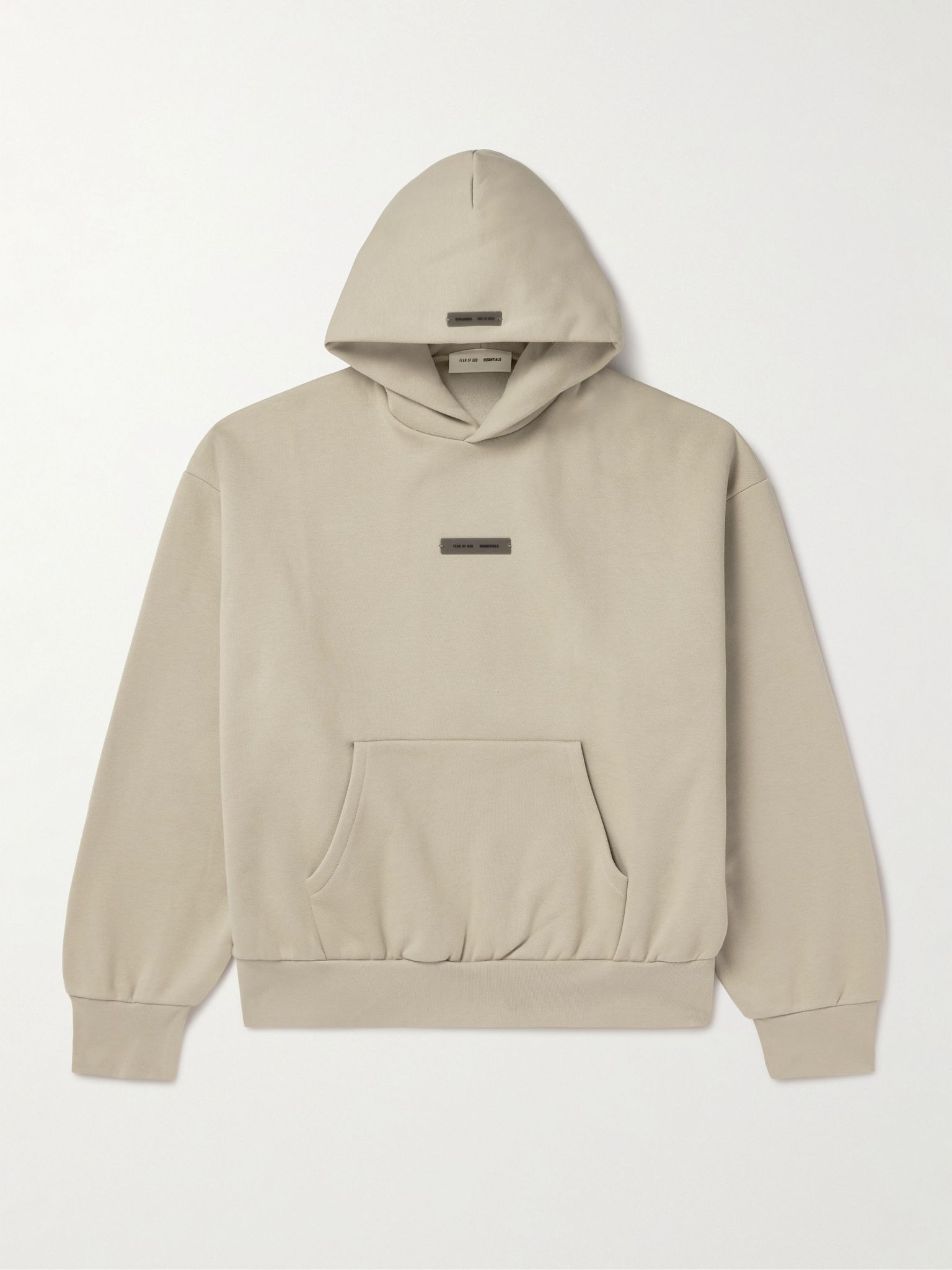 Fear of God Essentials' hoodie is cut from cotton-blend jersey, chosen for its softness and structure. It has oversized proportions with dropped shoulders and baggy sleeves. Metallic lettering spells out the label's name on the back. Size & Fit - Intended to be oversized; we recommend sizing down if you prefer a closer fit - Dropped shoulder seam - Mid-weight, slightly stretchy fabric - Model is shown wearing a S - Model measures: chest 36"/ 92cm, height 6'2"/ 188cm Details & Care - Beige fleece-back cotton-blend jersey - 80% cotton, 20% polyester - Hand wash - Unlined - Designer colour: Timber