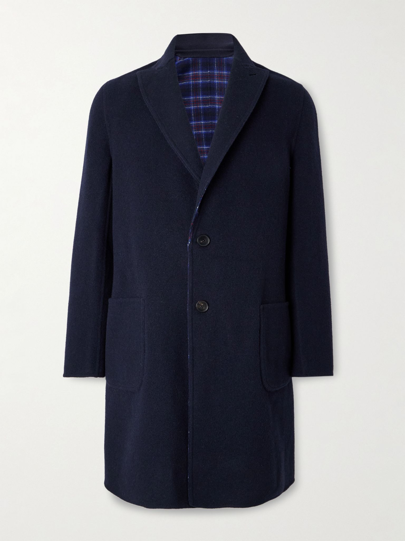 Etro's coat has a reversible design with solid navy on one side and a characterful check pattern on the other, so you can switch it up depending on the rest of your outfit. It's been made in Italy from insulating wool-blend felt. Size & Fit - Fits true to size. Take your normal size - Designed for a regular fit - Mid-weight, non-stretchy fabric - Model measures: chest 38"/ 96cm, height 6'2"/ 188cm Details & Care - Tonal-blue, white and claret wool-blend felt - Button fastenings - 57% wool, 32% polyester, 6% polyamide, 5% other fibres - Unlined - Dry clean