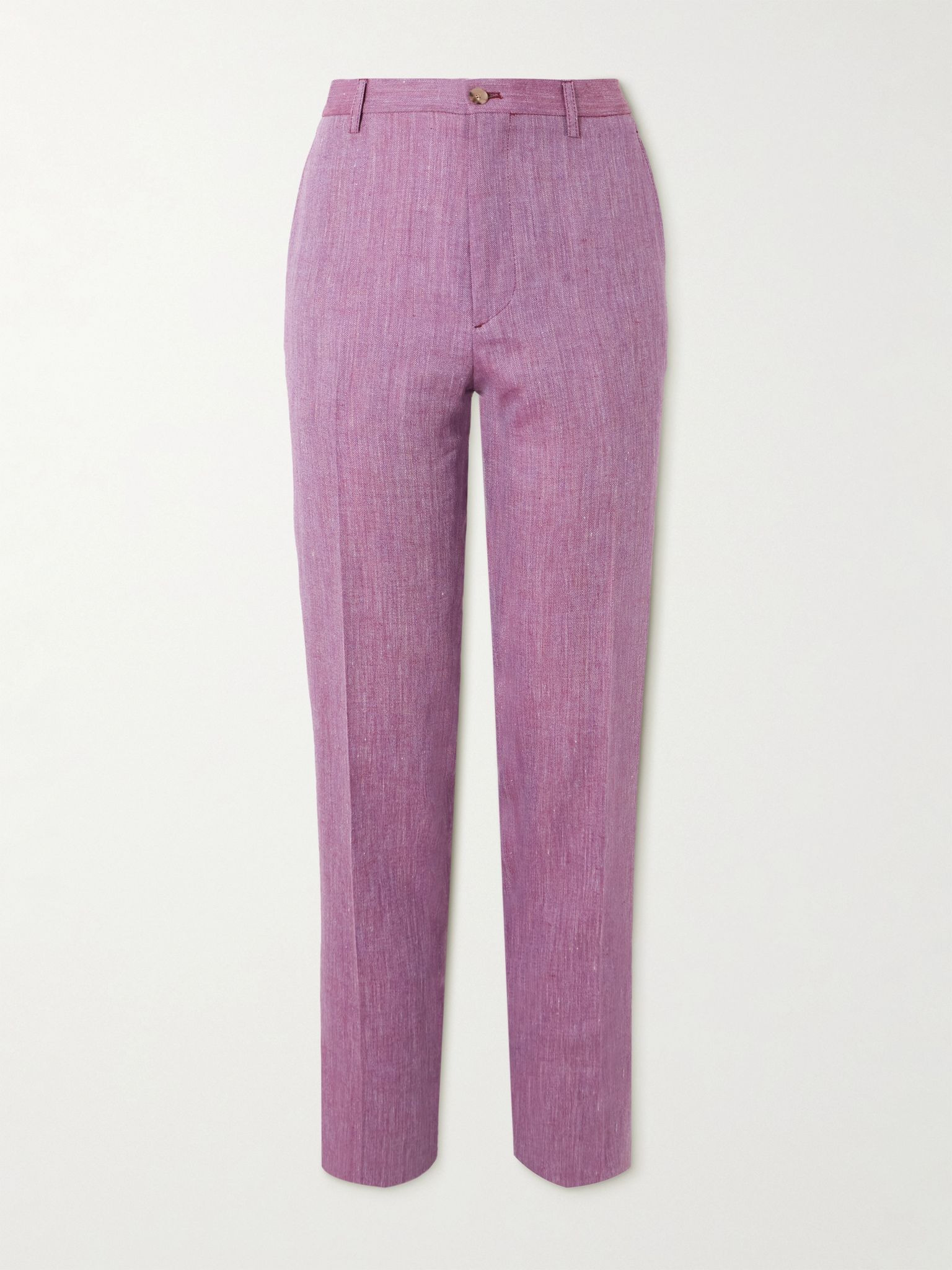 Etro's 'Roma' trousers are a purple melange, so they'll stand out against a sea of penguin suits. Cut tapered, they’ve been made in Italy from a broken-twill linen and wool-blend. Style yours with the matching jacket and a pocket square. Size & Fit - Fits true to size. Take your normal size - Tapered leg, mid-rise style - Unfinished hems; alter to fit - Lightweight, non-stretchy fabric - Model is shown wearing an IT 48 - Model measures: waist size 32, height 6'2"/ 188cm Details & Care - Purple melange linen and wool-blend - Belt loops, two front slash pockets, two back buttoned welt pockets, pressed creases, unfinished hems - Button and zip fastening - 60% linen, 40% wool - Unlined - Dry clean