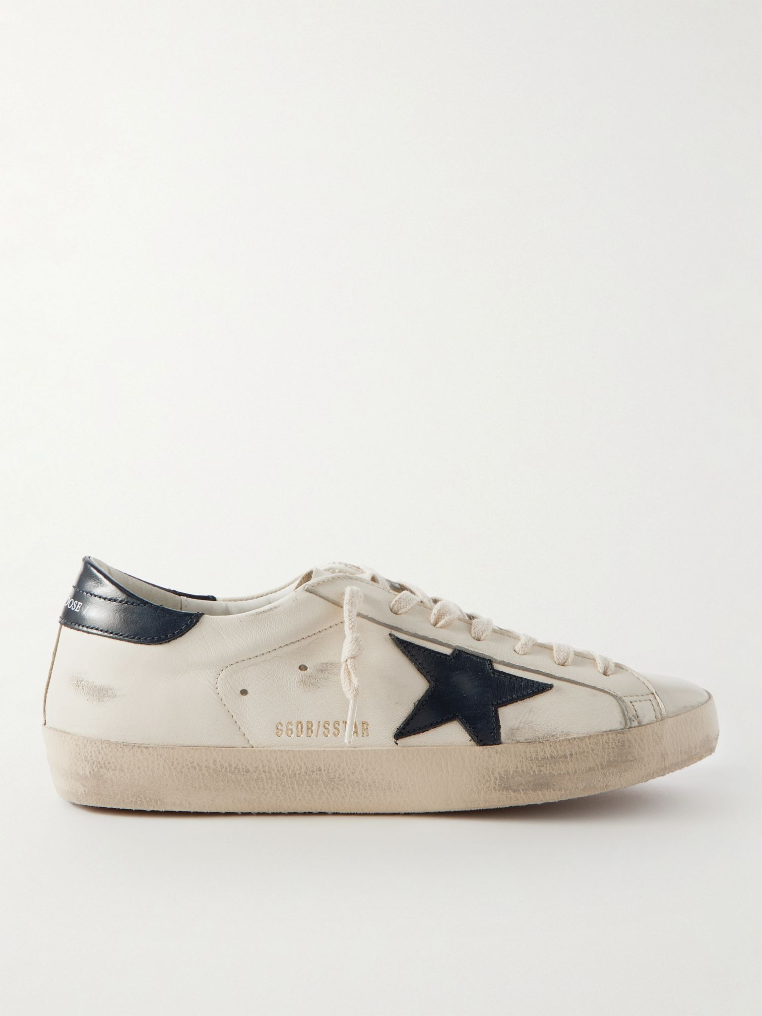 No two pairs of Golden Goose sneakers are ever the same – the distressed appearance is done by hand to create a lived-in feel. These low-profile 'Superstars' are made from leather that breaks in nicely over time and detailed with white lettering, as well as the brand's trademark star. Size & Fit - Fits true to size. Take your normal size - European sizing Details & Care - Offf-white and midnight leather (Calf) - Lace-up - Style number: GMF00101.F004164.15430