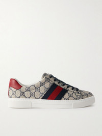 Launched in 2016, Gucci's 'Ace' sneakers quickly gained a massive following and have seen countless renditions ever since. This version has been made in Italy from coated-canvas jacquard-woven with the house's 'GG Supreme' monogram and detailed with signature striped webbing. Contrasting red leather heel tabs add a final pop of colour. Size & Fit - Fits true to size. Take your normal size - UK sizing Details & Care - Beige canvas, green and red leather (Calf) - Lace-up - Style number: 760775FACMZ