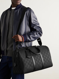 Gucci's 'Edge' duffle bag is made from matte black rubber that's subtly stamped with the house's 'GG' monogram. It's trimmed with durable leather and has plenty of space inside for overnight essentials, including a pair of shoes and a wash bag. Details & Care - Black rubber and leather (Cow) - Top handles, detachable adjustable webbing shoulder strap - Scuba lining - Two-way zip fastening - Comes with dust bag