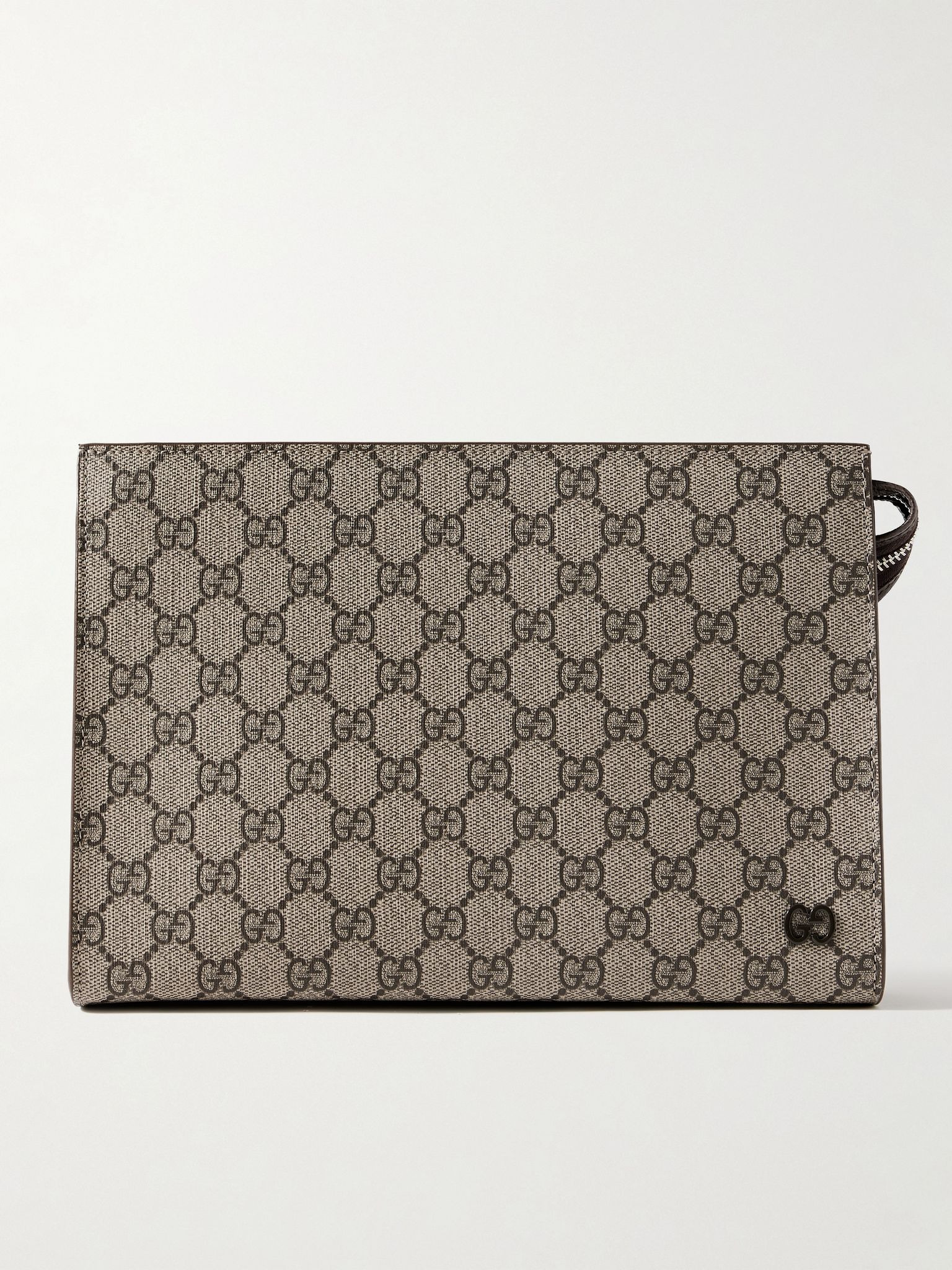 Gucci's Italian-made pouch is crafted from signature coated-canvas, which is printed with an allover 'GG' monogram. It's trimmed with leather and opens to a slim interior with six card slots and enough space to hold your phone and keys. Details & Care - Tonal-brown coated-canvas, brown textured-leather (Calf) - Removable strap - Internal card slots - Leather lining - Zip fastening - Comes with dust bag